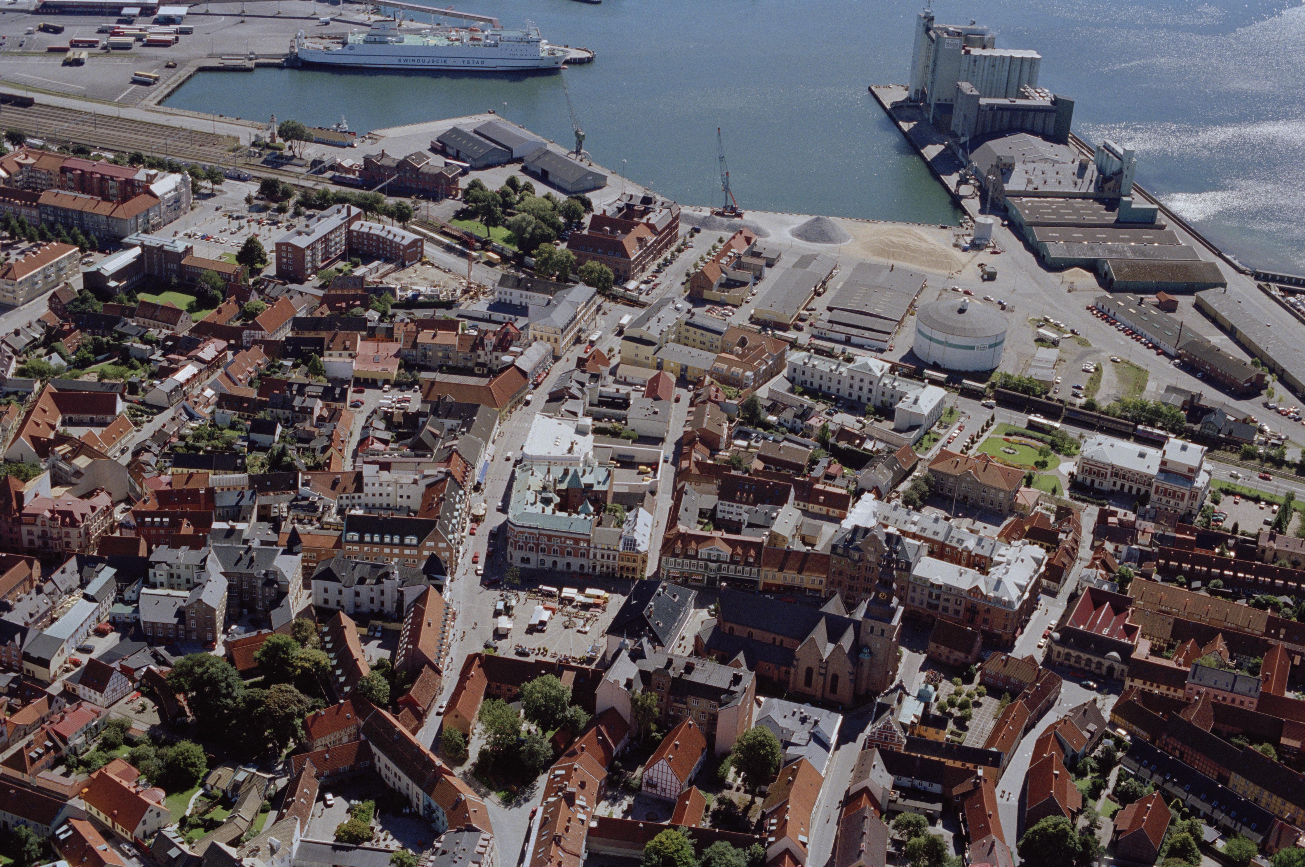 Beskrivning: Ystads stad och hamn. Sankta Maria kyrka under bildens mitt. Bilden är tagen mot (väderstreck): SO