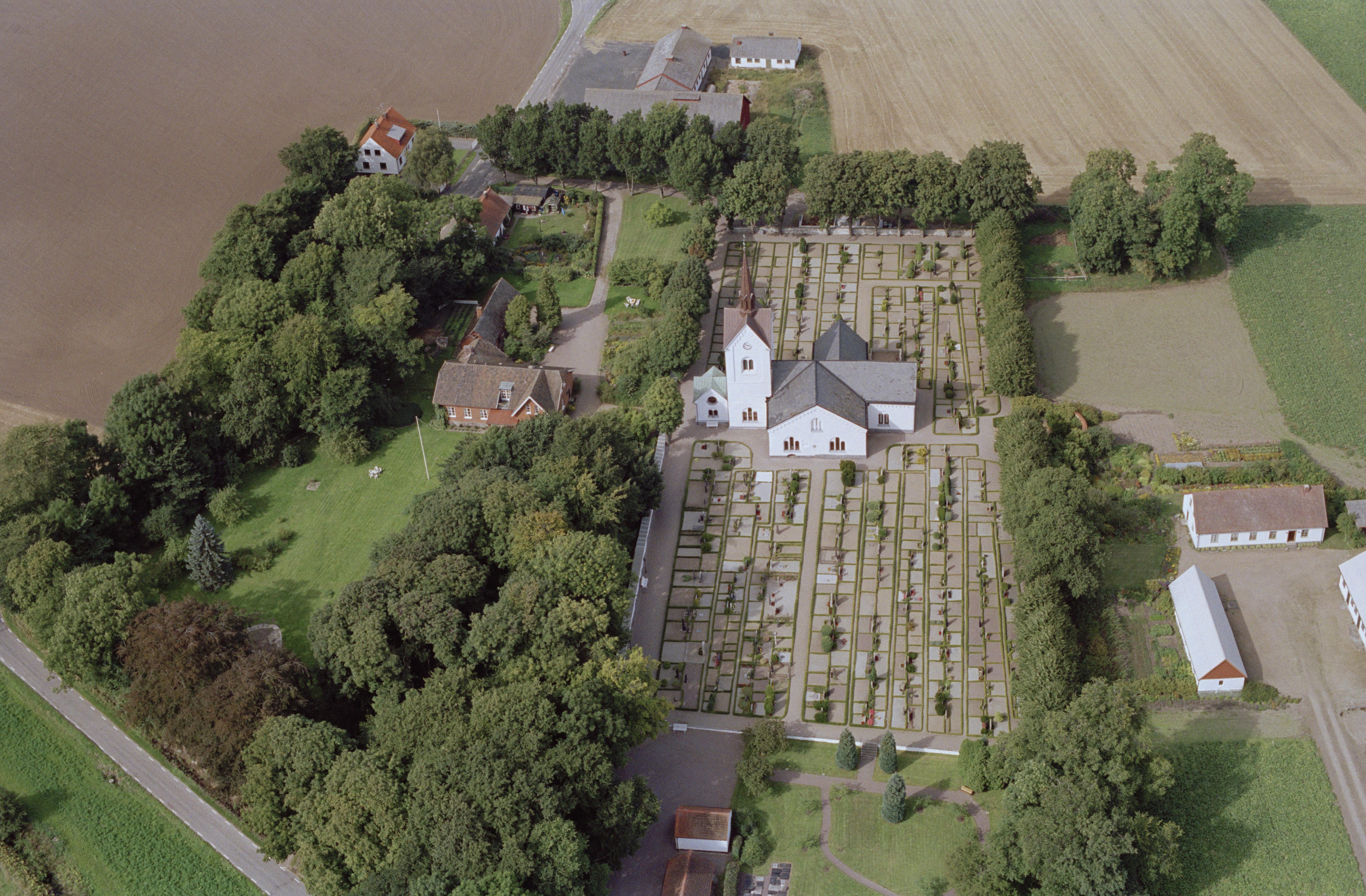 Beskrivning: Östra Vemmenhögs kyrka. Uppe till höger högen Väpmannahög RAÄnr Östra Vemmenhög 2:1. Bilden är tagen mot (väderstreck): NNV