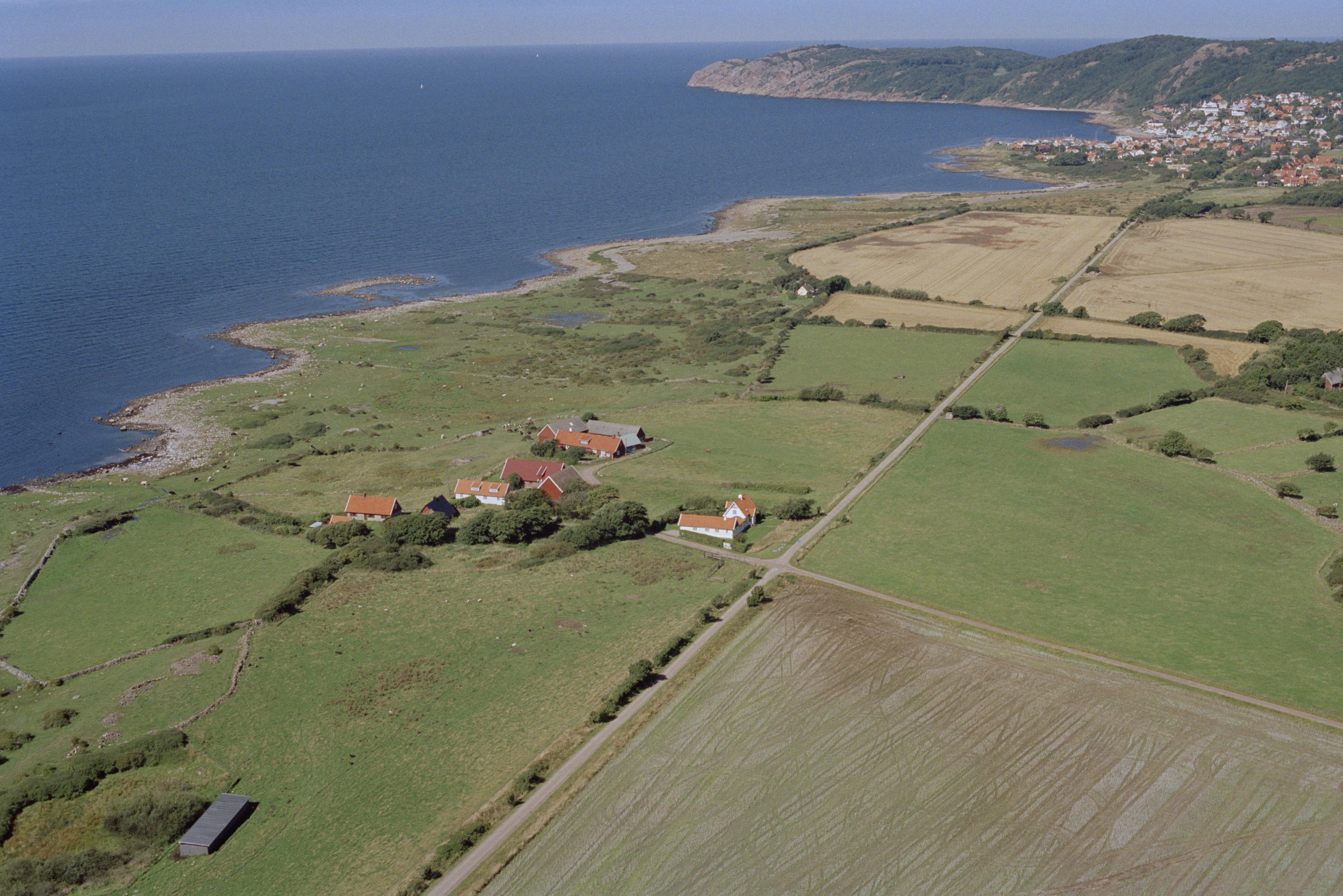 Beskrivning: Kullaberg, sydvästra delen vid Vattenmöllan och Möllehässle. Röse RAÄnr Brunnby 247:1-2 och kar vid stranden. I bildens övre del Mölle tätort i Västra Kullaberg. Bilden är tagen mot (väderstreck): VNV