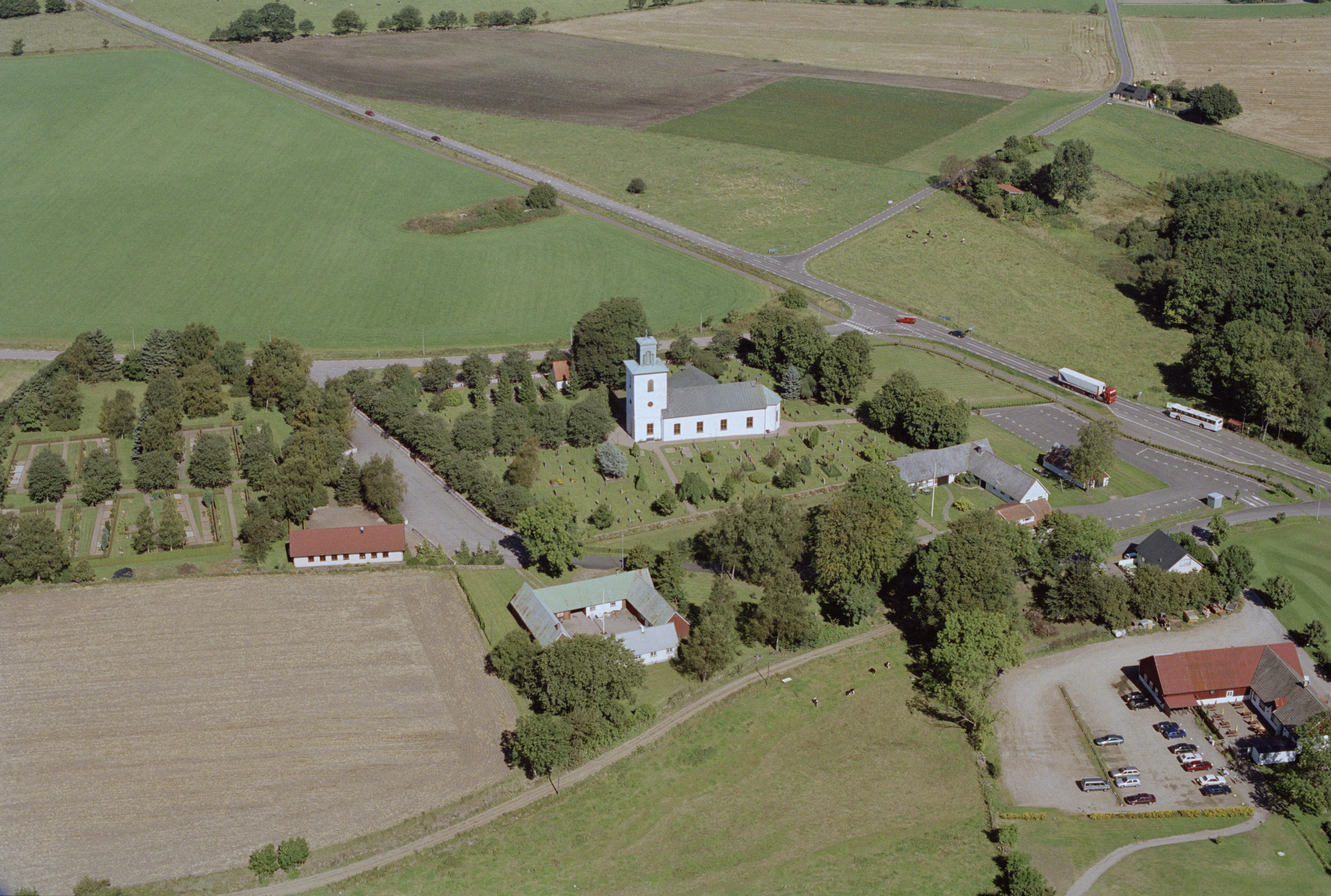 Beskrivning: Grevie kyrka och kyrkby. Bilden är tagen mot (väderstreck): N