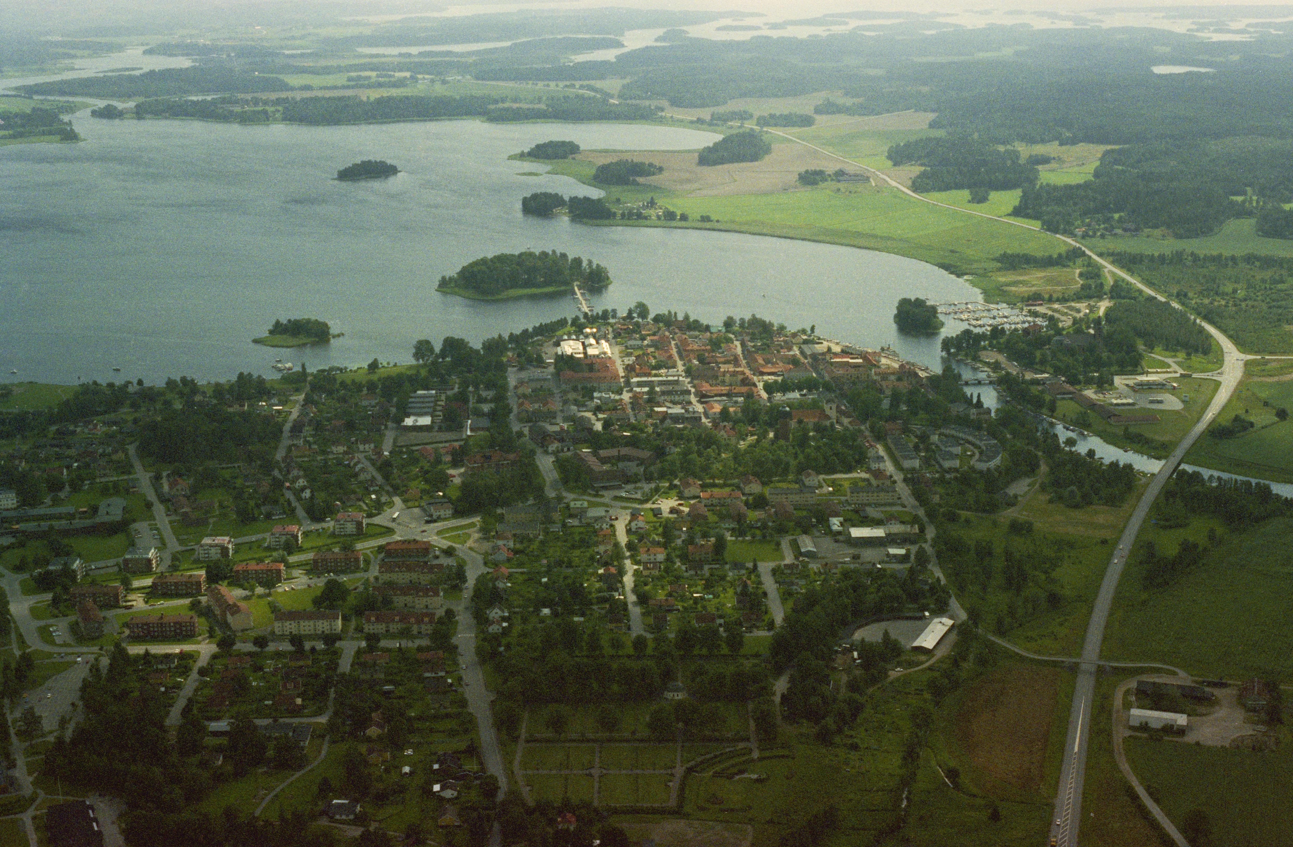 Beskrivning: Askersunds tätort vid sjön Alsen. Sofia Magdalena kyrka vid bildens mitt. Till höger Askersunds Landskyrka vid Sundet. Bilden är tagen mot (väderstreck): S