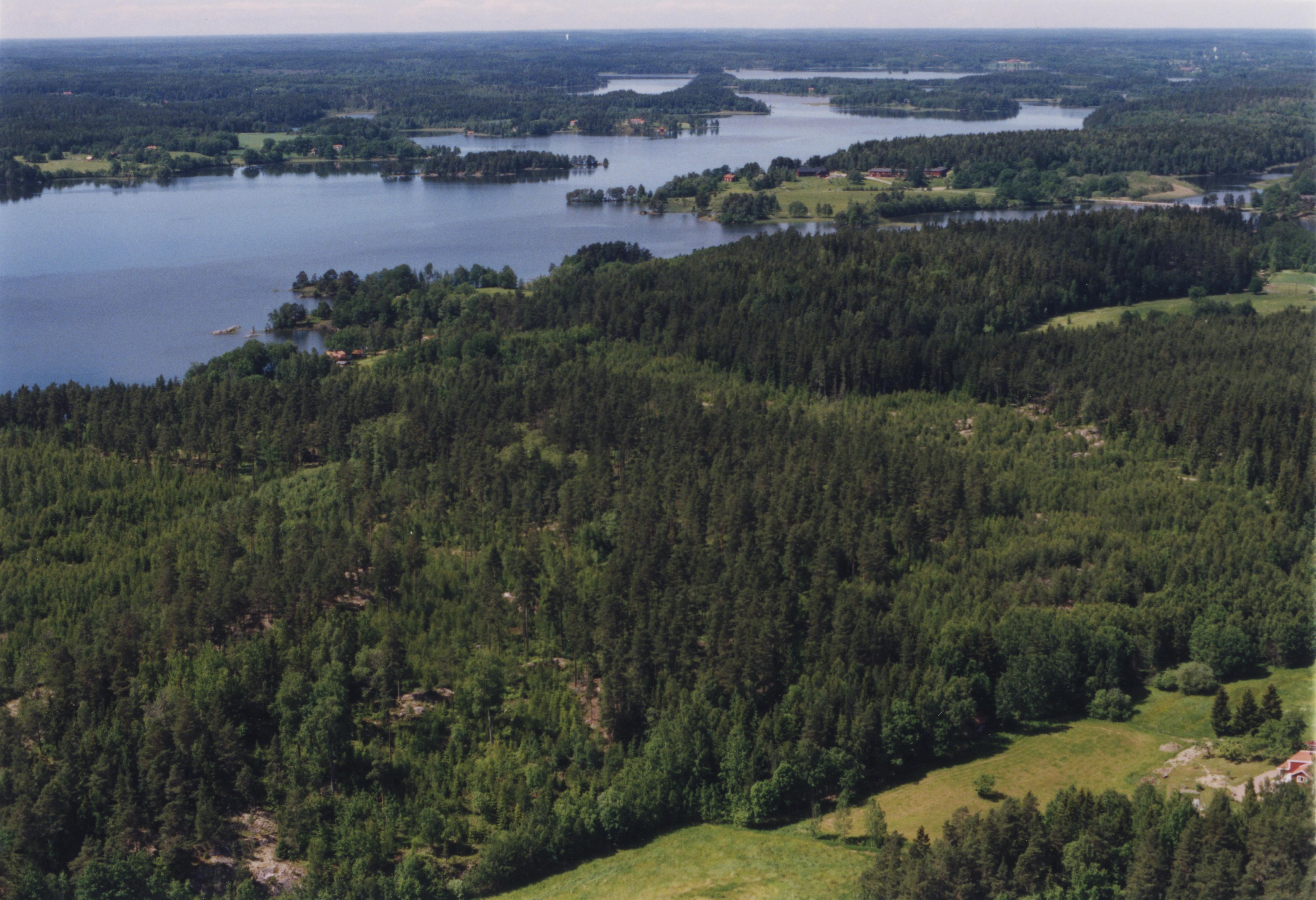 Beskrivning: Hyltingeö vid sjön Båven. Fornborg RAÄnr Hyltinge 62:1 vid bildens mitt. Överby Lillgård uppe till höger. I bildens övre del bron till Aspön och Aspö kursgård i Helgesta socken. Bilden är tagen mot (väderstreck): V