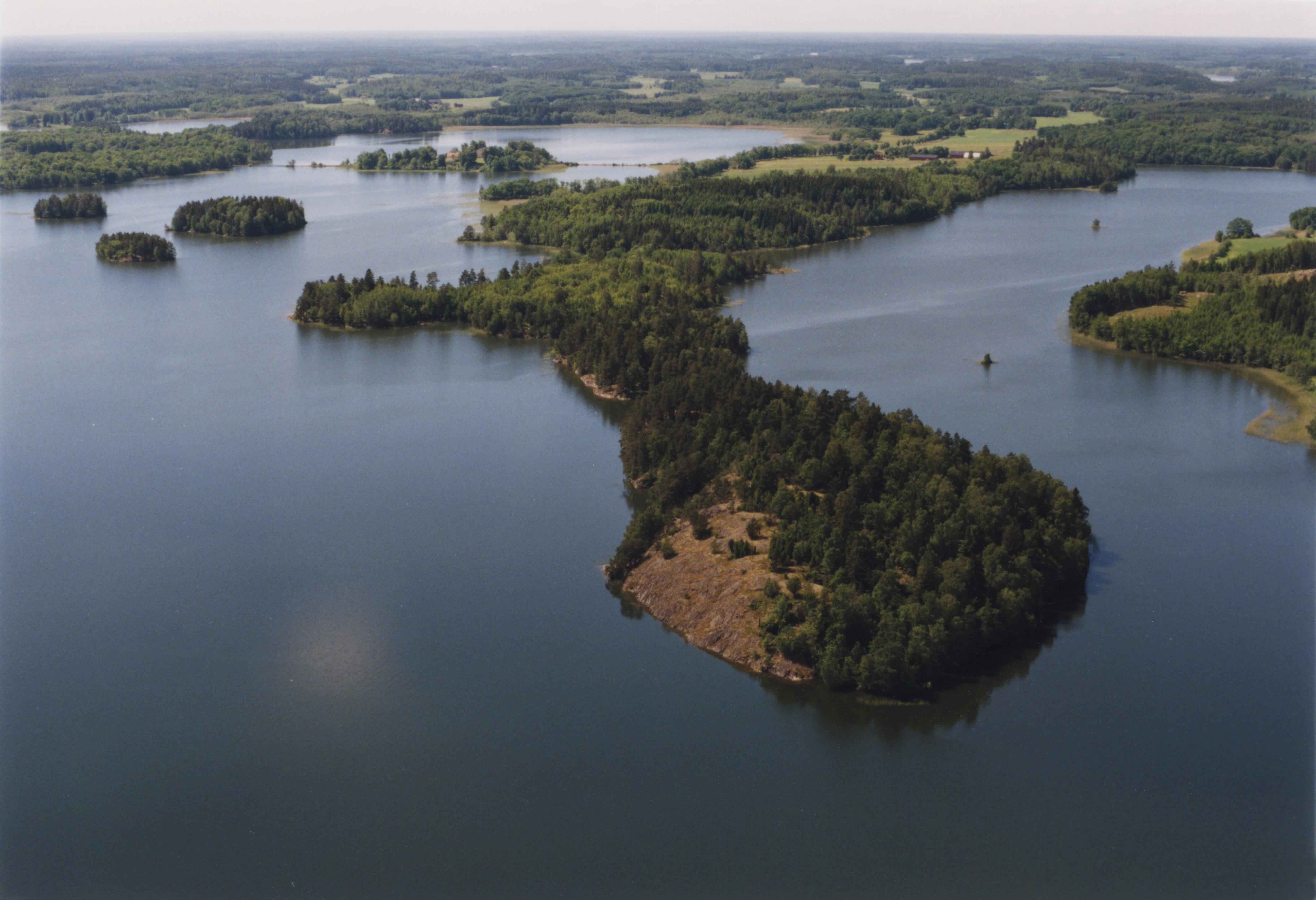 Beskrivning: Djurön i sjön Båven. Fornborg RAÄnr Årdala 124:1 "Fyrstens fornborg". I bildens övre del till vänster Vibyholms slott. Bilden är tagen mot (väderstreck): SV