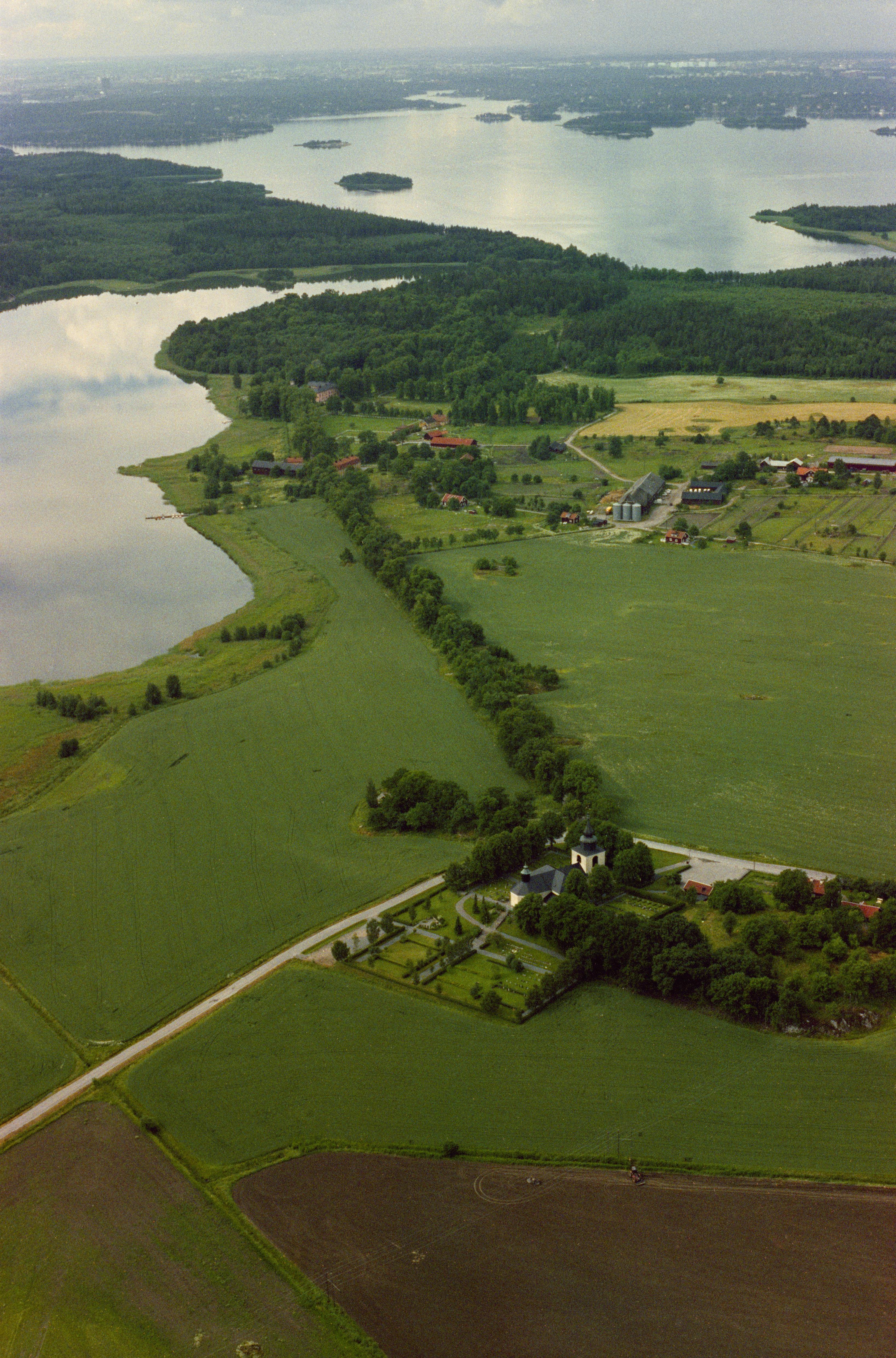 Beskrivning: Östra Ryds kyrka. I bildens övre del Rydboholms slott med Vasatornet - byggnadsminne RAÄnr Östra Ryd 70:1. Kyrkfjärden till vänster och fjärden Stora Värtan uppe till höger. Bilden är tagen mot (väderstreck): VSV
