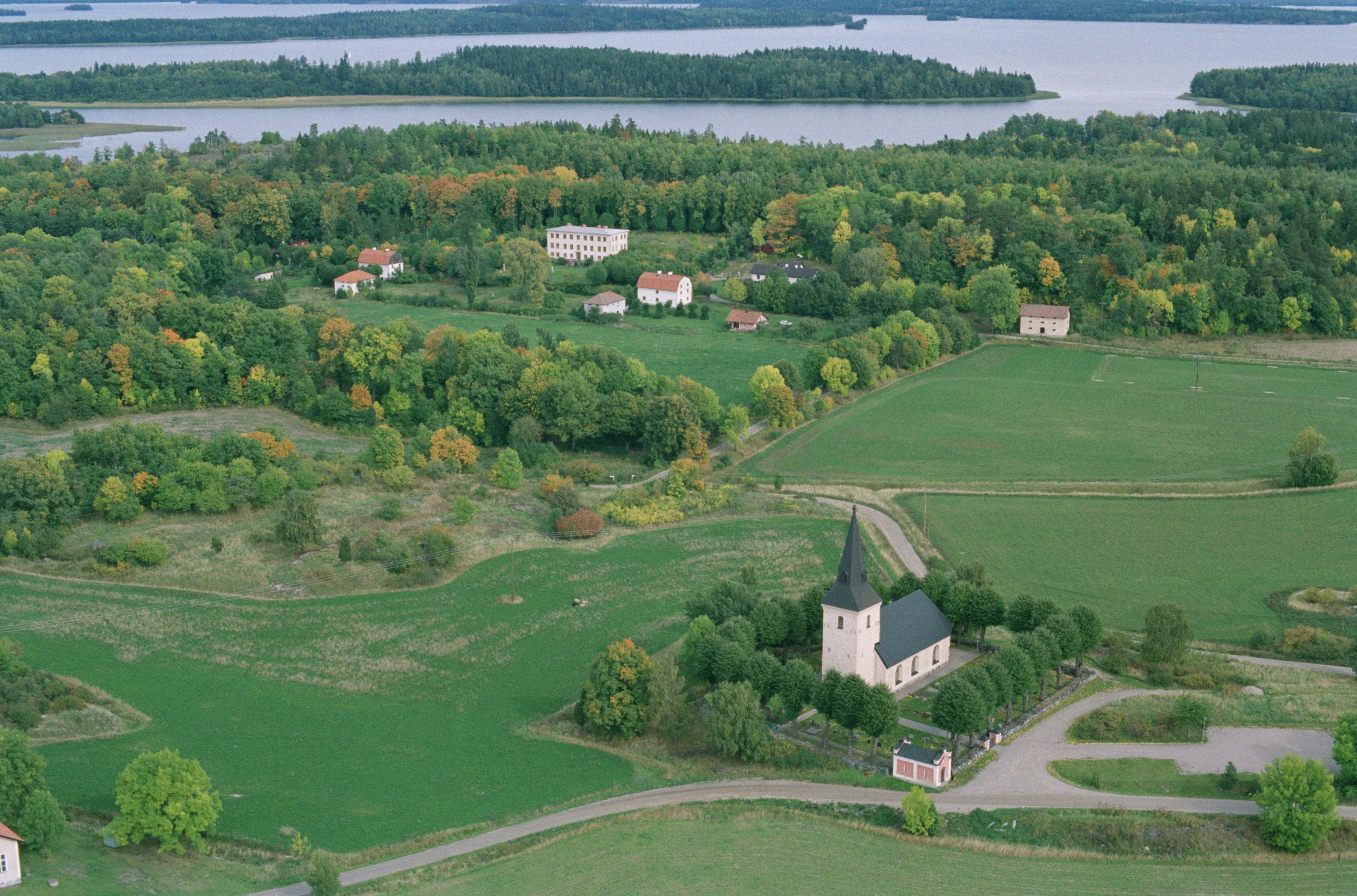 Beskrivning: Överenhörna kyrka. Till vänster om bildens mitt bytomt Husby backe RAÄnr Överenhörna 61:1-4. I bildens övre del Ekensbergs herrgård vid Hornboviken i Mälaren. Bilden är tagen mot (väderstreck): ONO