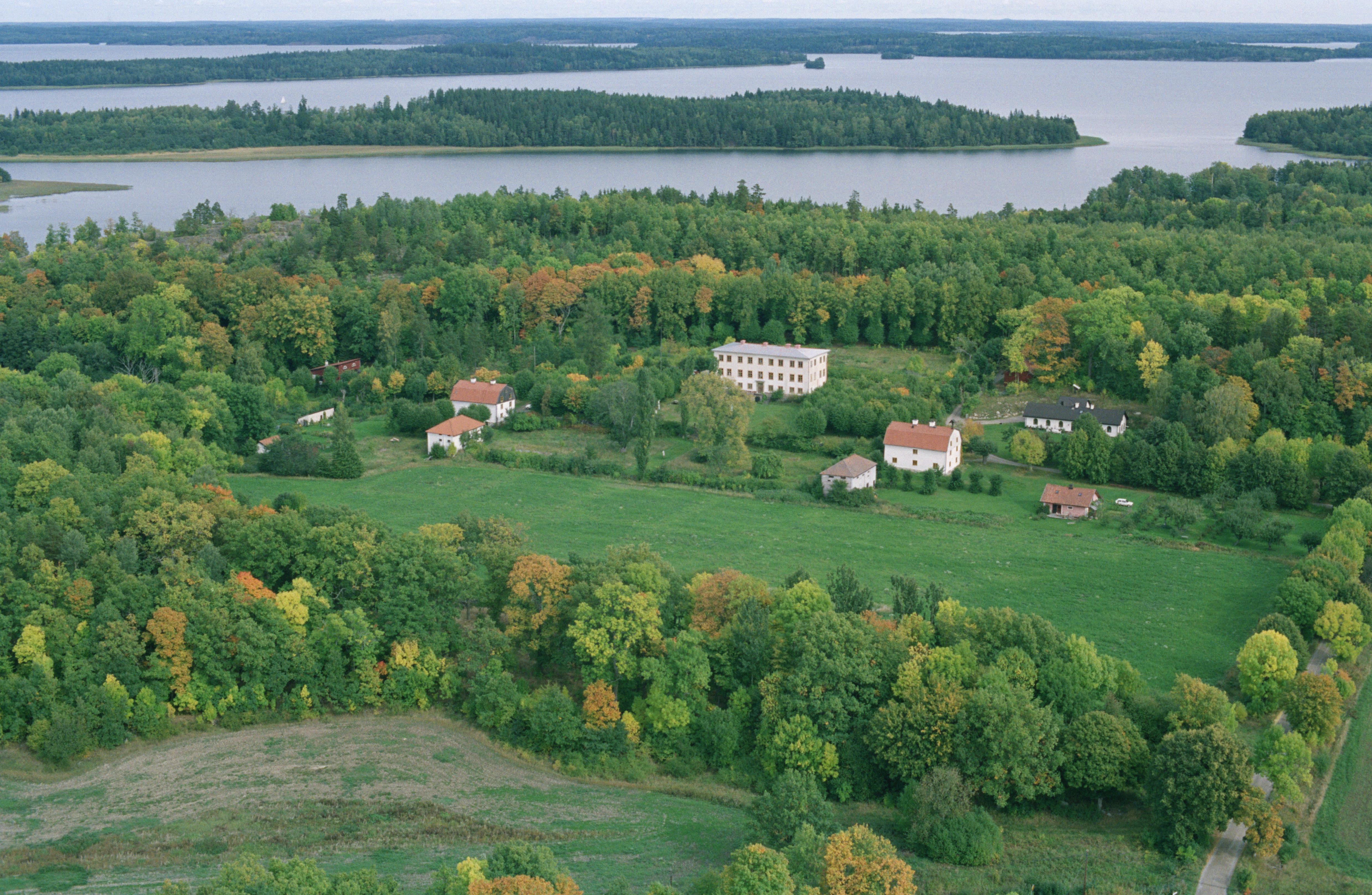 Beskrivning: Ekensbergs herrgård vid Hornboviken i Mälaren. I bildens nedre del fornlämningsområde med bl.a. bytomt Husby backe RAÄnr Överenhörna 61:1. Bilden är tagen mot (väderstreck): ONO