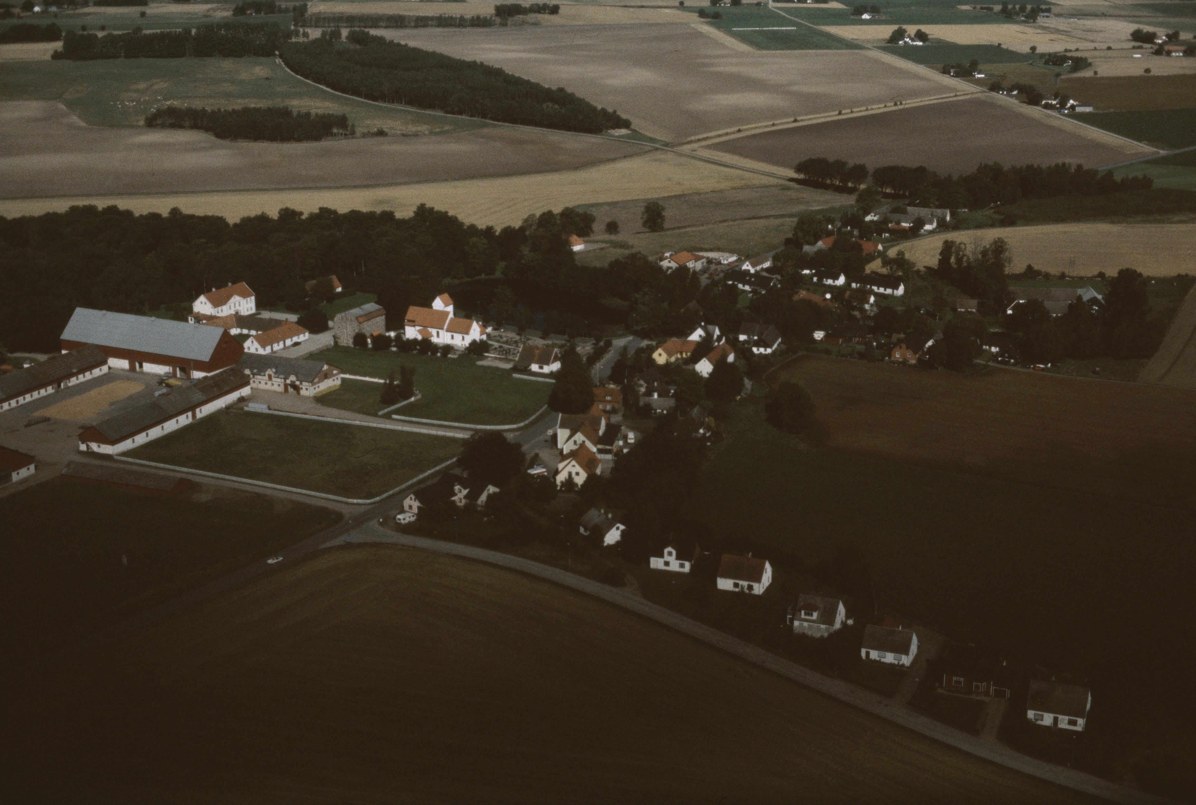 Beskrivning: Östra Ingelstads kyrka och Ingelstads herrgård till vänster. (NB! Bilden är skadat = mycket mörk.) Bilden är tagen mot (väderstreck): NNV