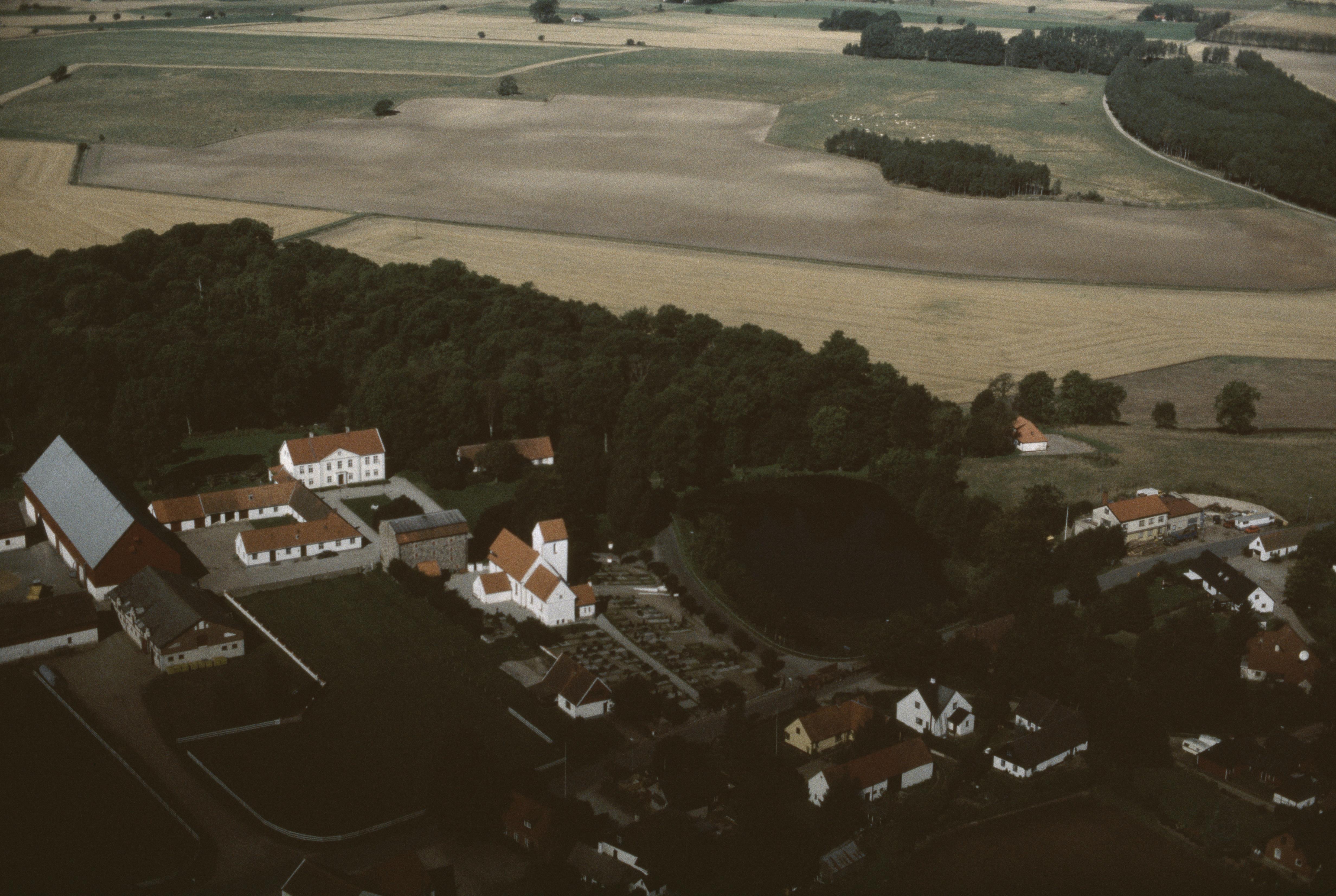 Beskrivning: Östra Ingelstads kyrka och Ingelstads herrgård till vänster. (NB! Bilden är skadat = mycket mörk.) Bilden är tagen mot (väderstreck): NV
