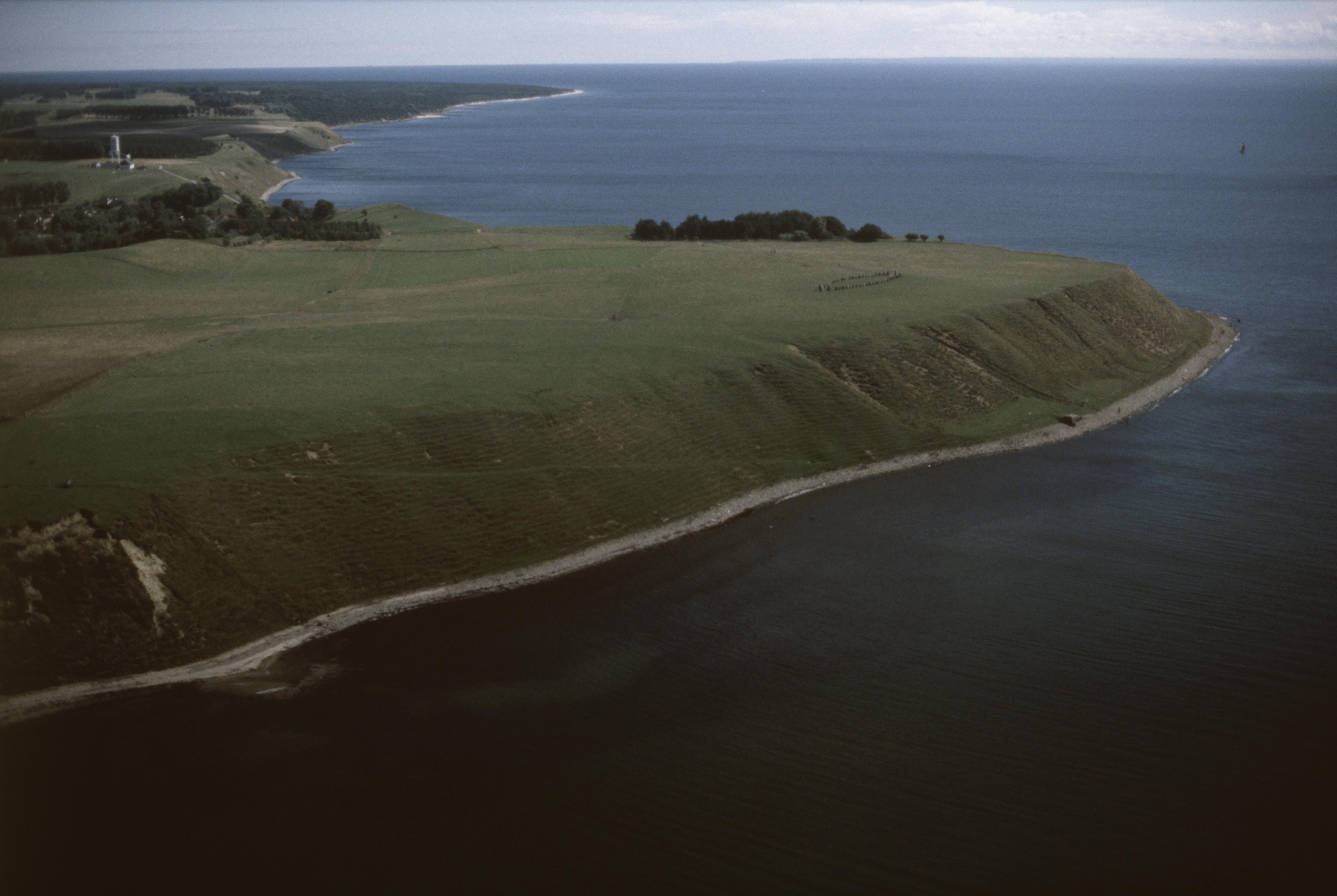 Beskrivning: Uppe till höger skeppssättningen Ales stenar RAÄnr Valleberga 20:1 vid Kåseberga. Bilden är tagen mot (väderstreck): OSO