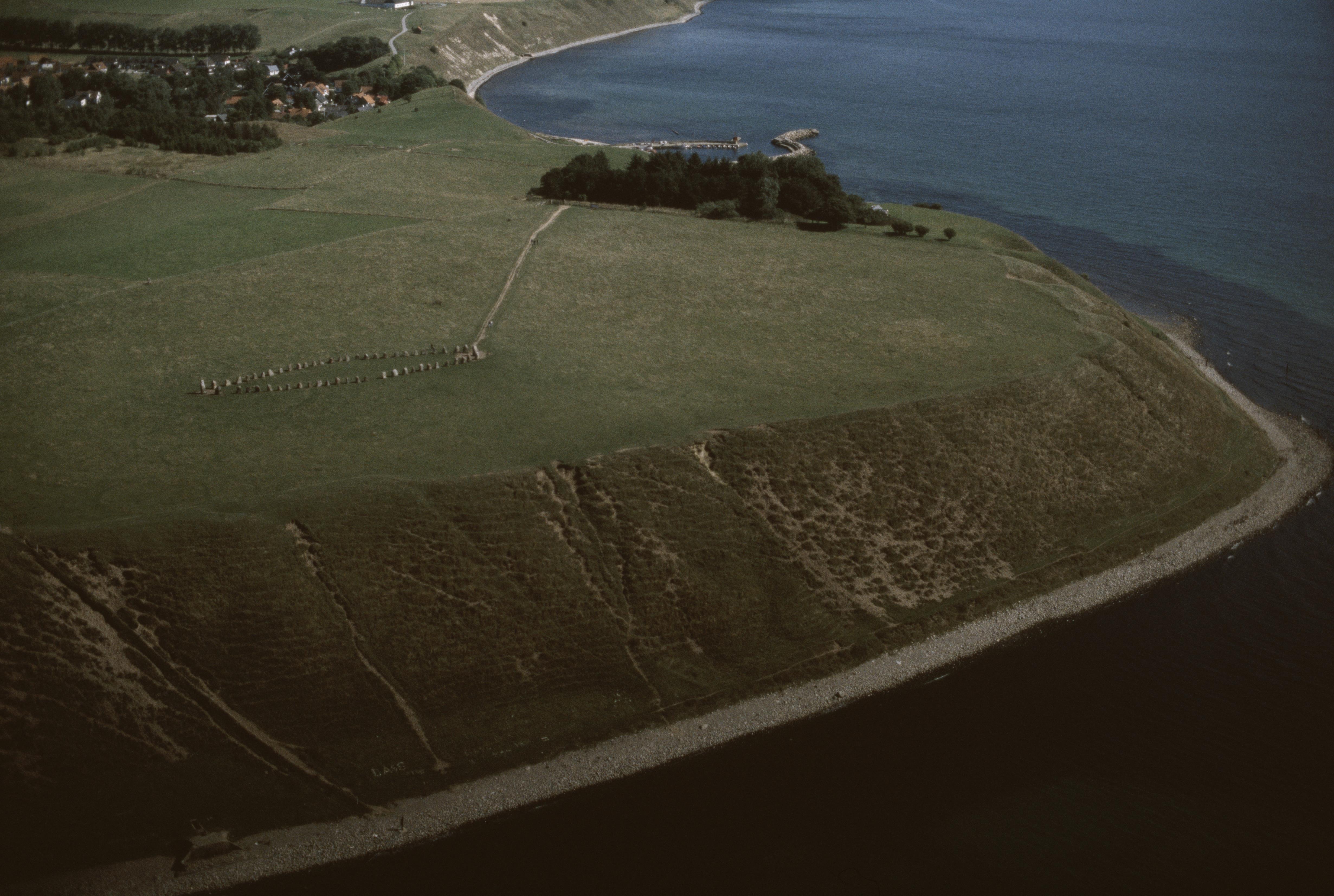 Beskrivning: Skeppssättningen Ales stenar RAÄnr Valleberga 20:1 vid Kåseberga. Bilden är tagen mot (väderstreck): Ö