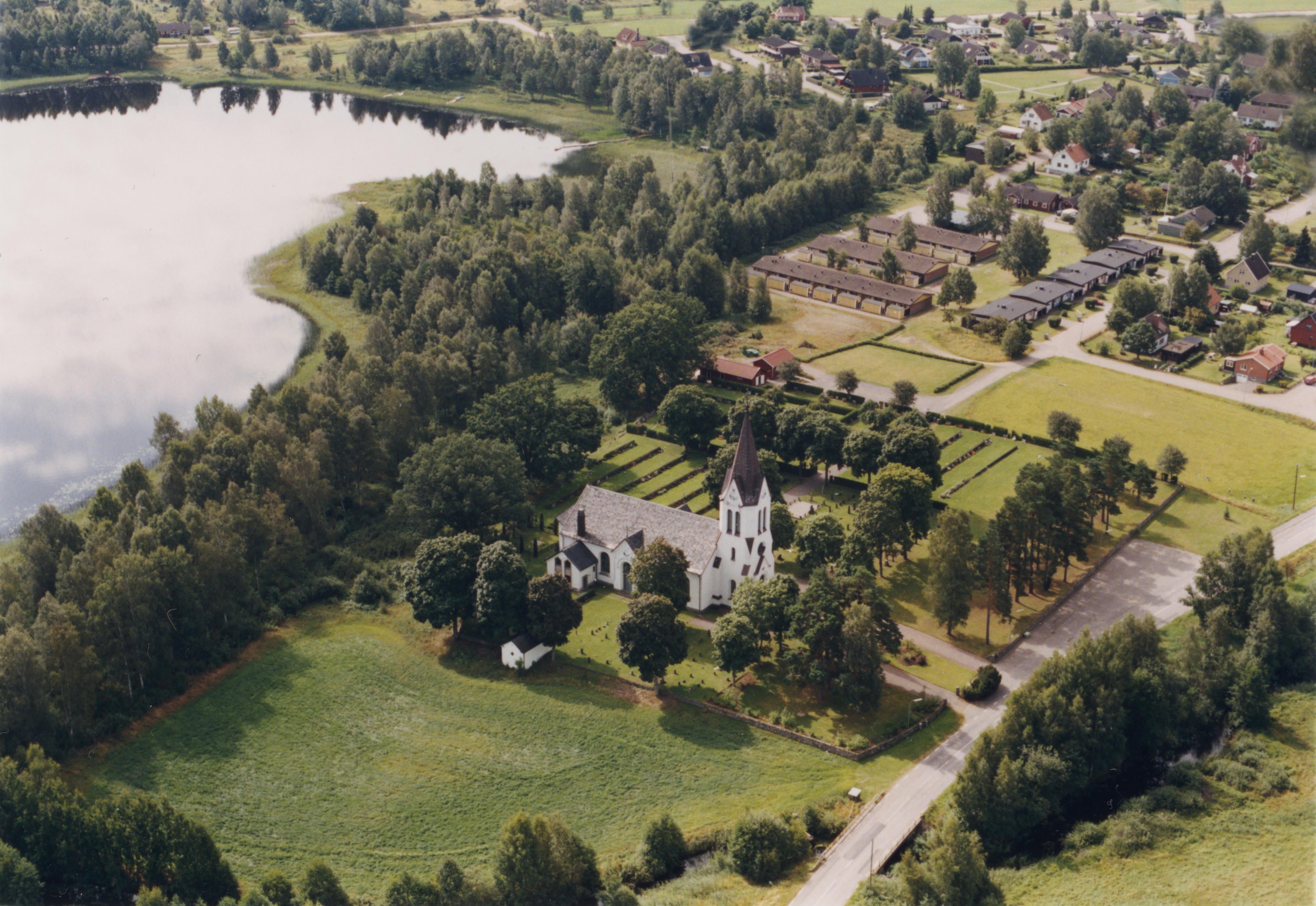 Beskrivning: Fågelfors tätort. Fågelfors kyrka vid Klobosjön. Bilden är tagen mot (väderstreck): S