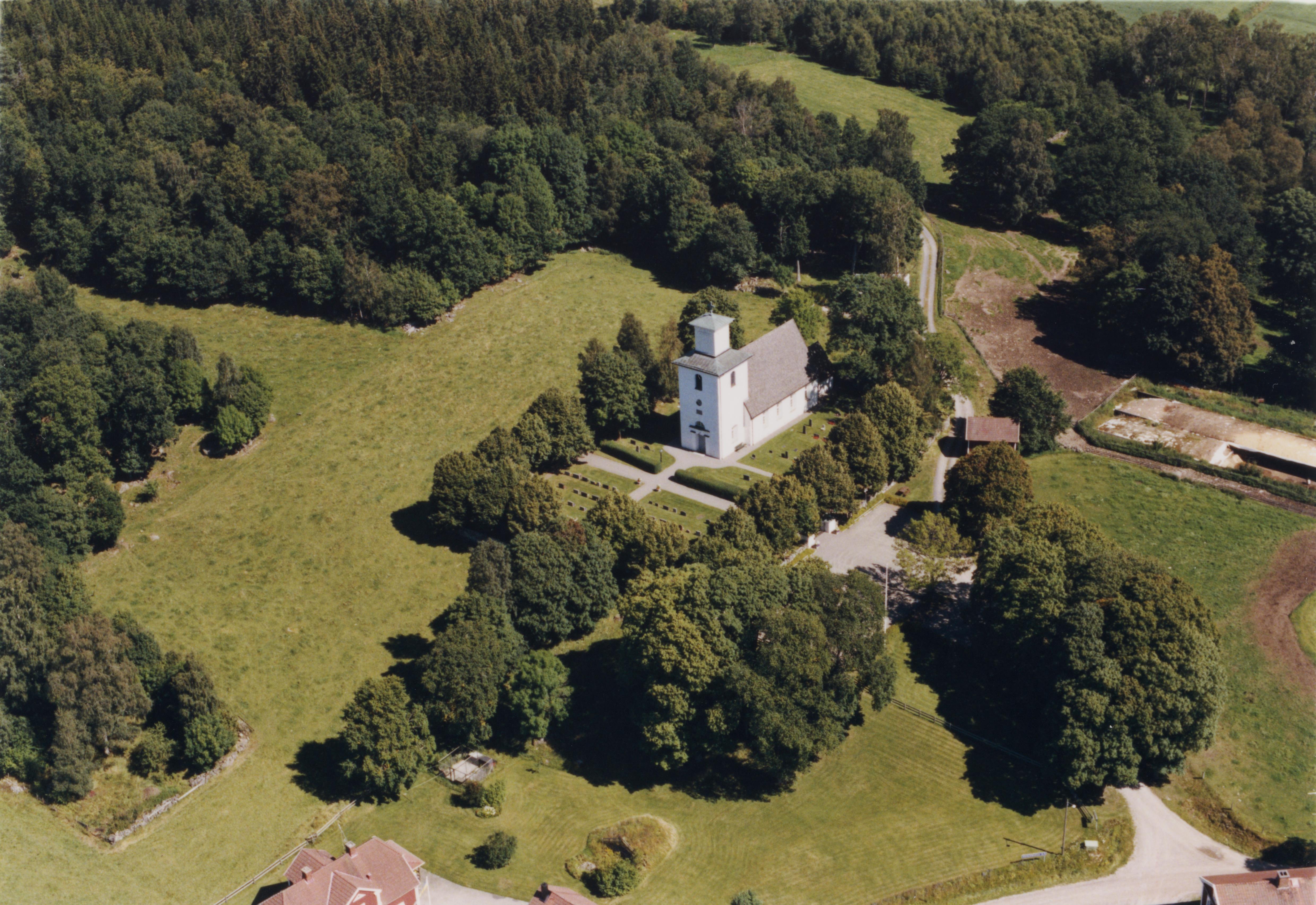 Beskrivning: Ormesberga kyrka vid bildens mitt. I bildens nedre del bytomt RAÄnr Ormesberga 55:1. Bilden är tagen mot (väderstreck): NO