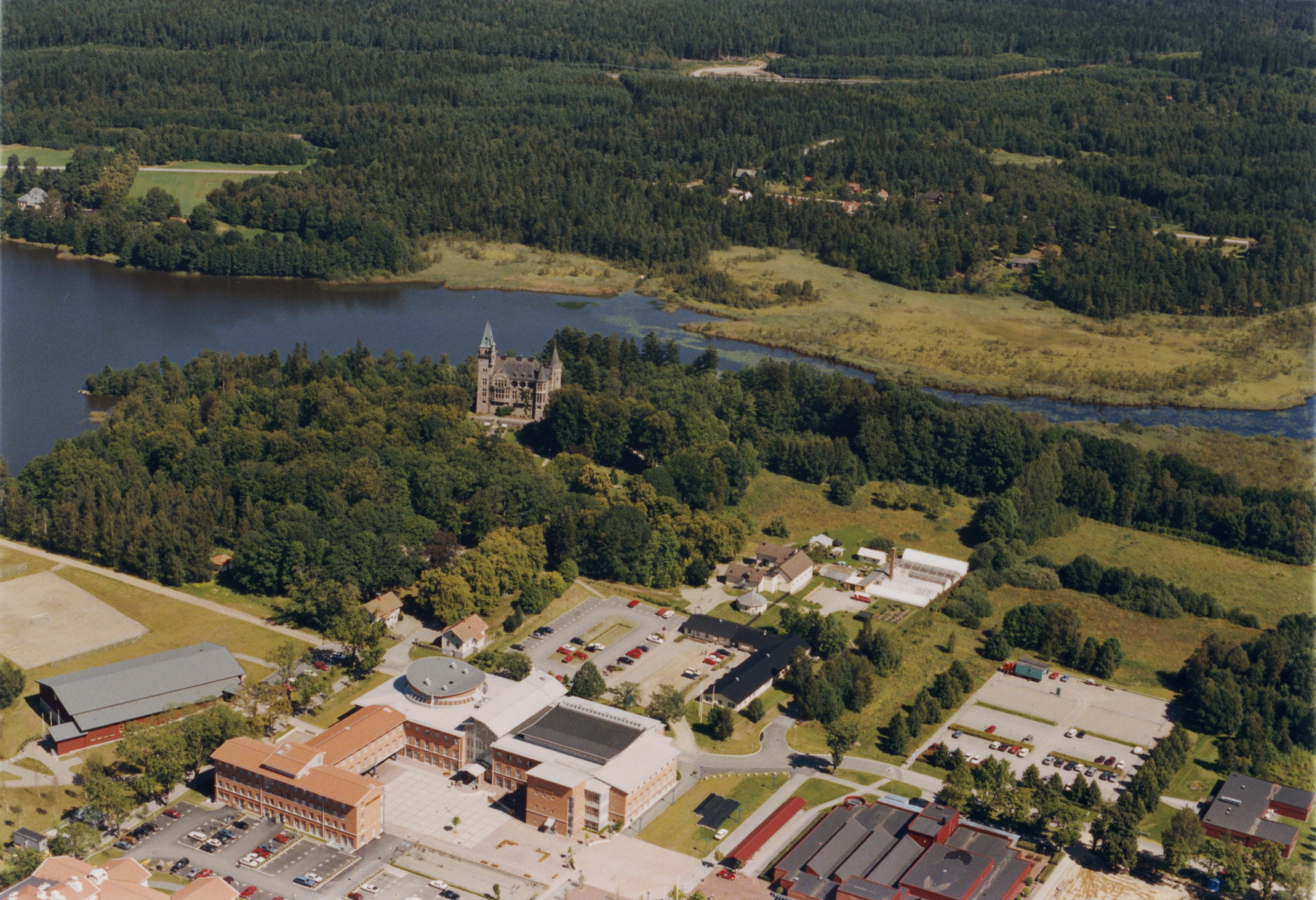 Beskrivning: Stadsdelen Teleborg i Växjö stad. Linnéuniversitetet i bildens nedre del. Slottet Teleborg vid sjön Trummen i bildens övre del. Bilden är tagen mot (väderstreck): NO