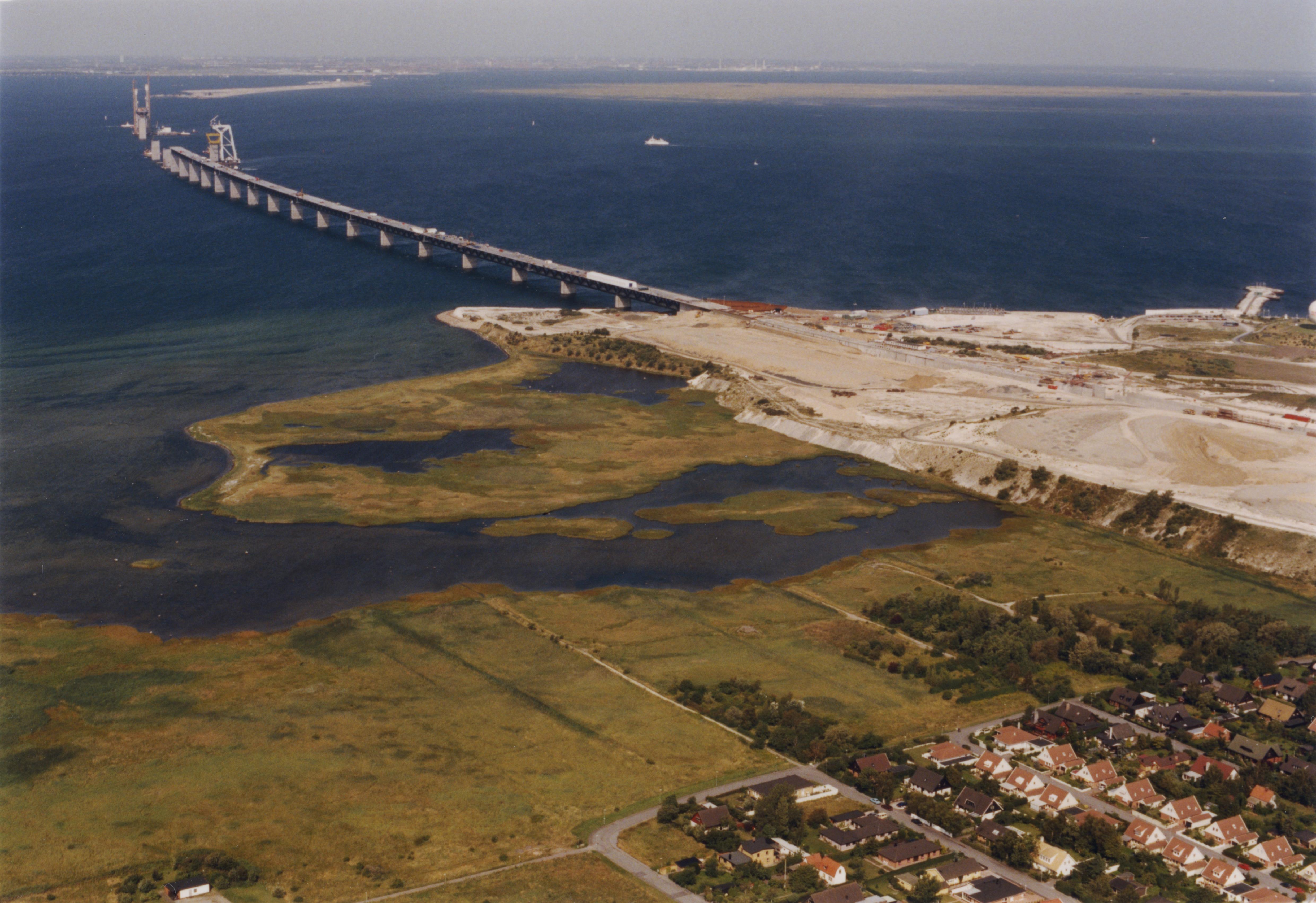 Beskrivning: Tätorten Bunkeflostrand vid sockengränsen Bunkeflo och Malmö. I bildens övre del Öresundsbron och Limhamns kalkbrott vid Sibbarp, Malmö. Bilden är tagen mot (väderstreck): NV