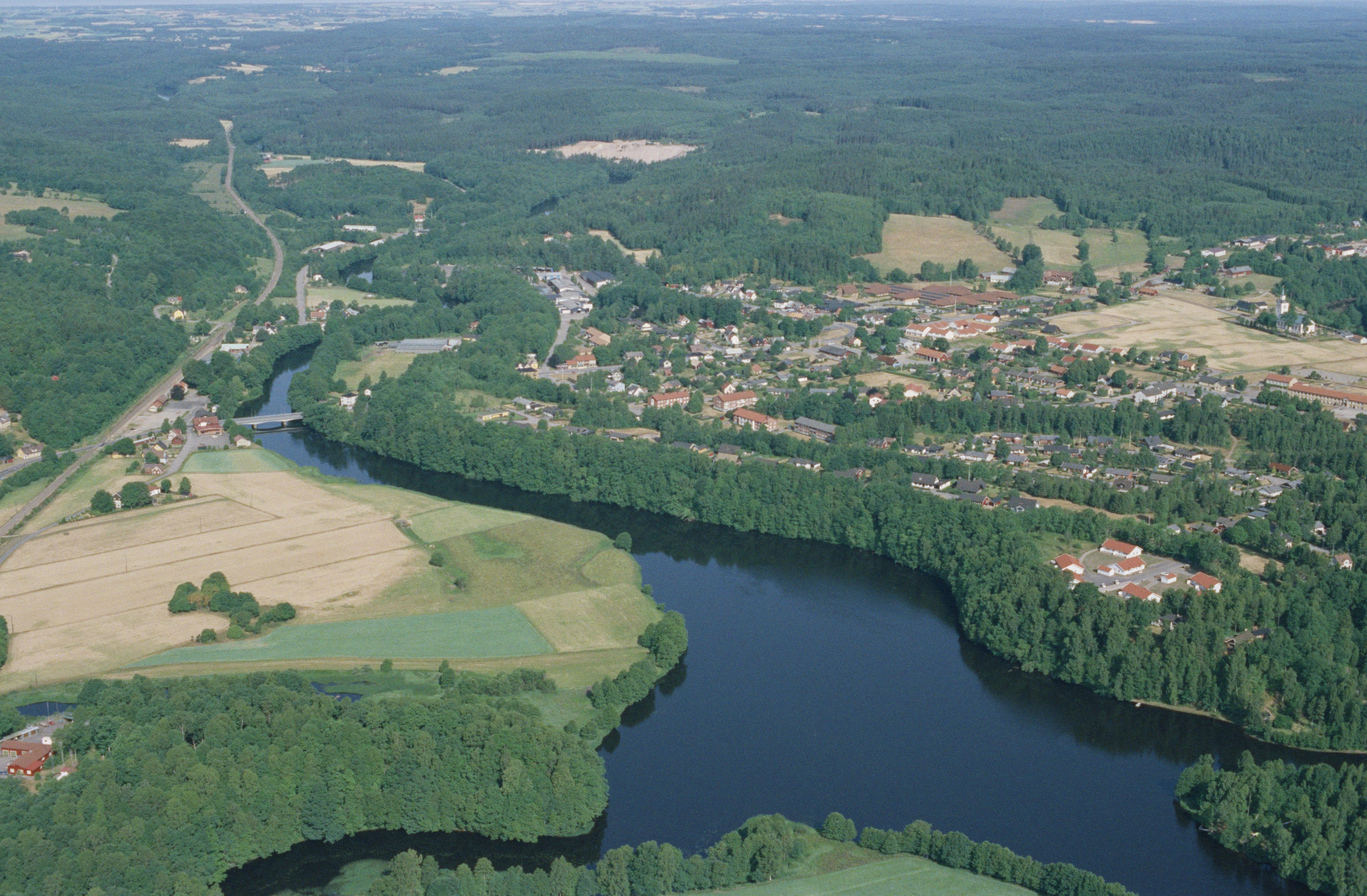 Beskrivning: Knäreds tätort vid ån Lagan i Lagadalen. Knäreds kyrka till höger i bildens övre del. Bilden är tagen mot (väderstreck): VNV