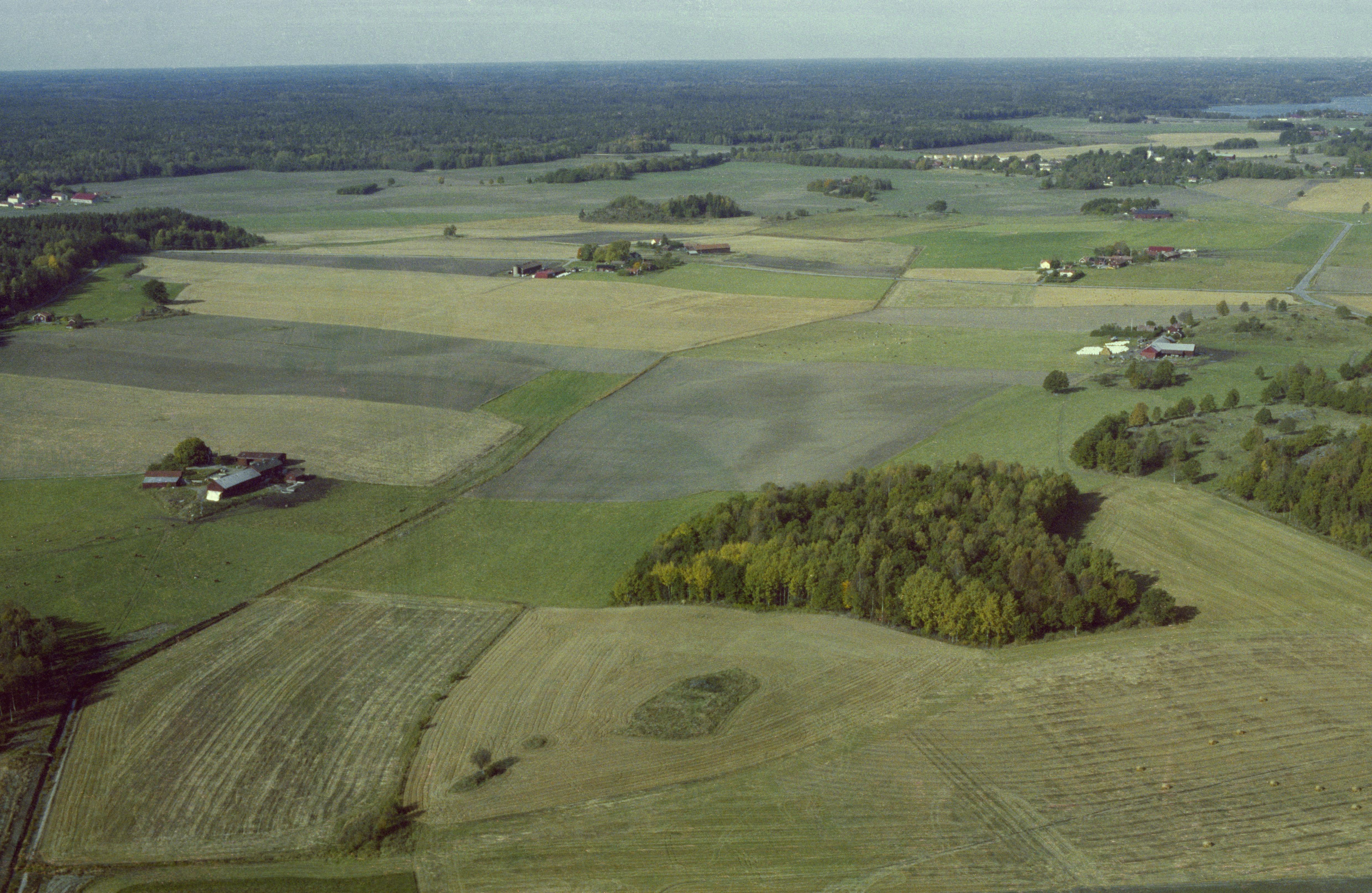 Beskrivning: Sörtuna till vänster. Fyndplats för guldskatt RAÄnr Västerljung 48:1 vid Tuna gård i bildens mitt, Västerljungs kyrka och kyrkby i bildens övre del. Bilden är tagen mot (väderstreck): NV
