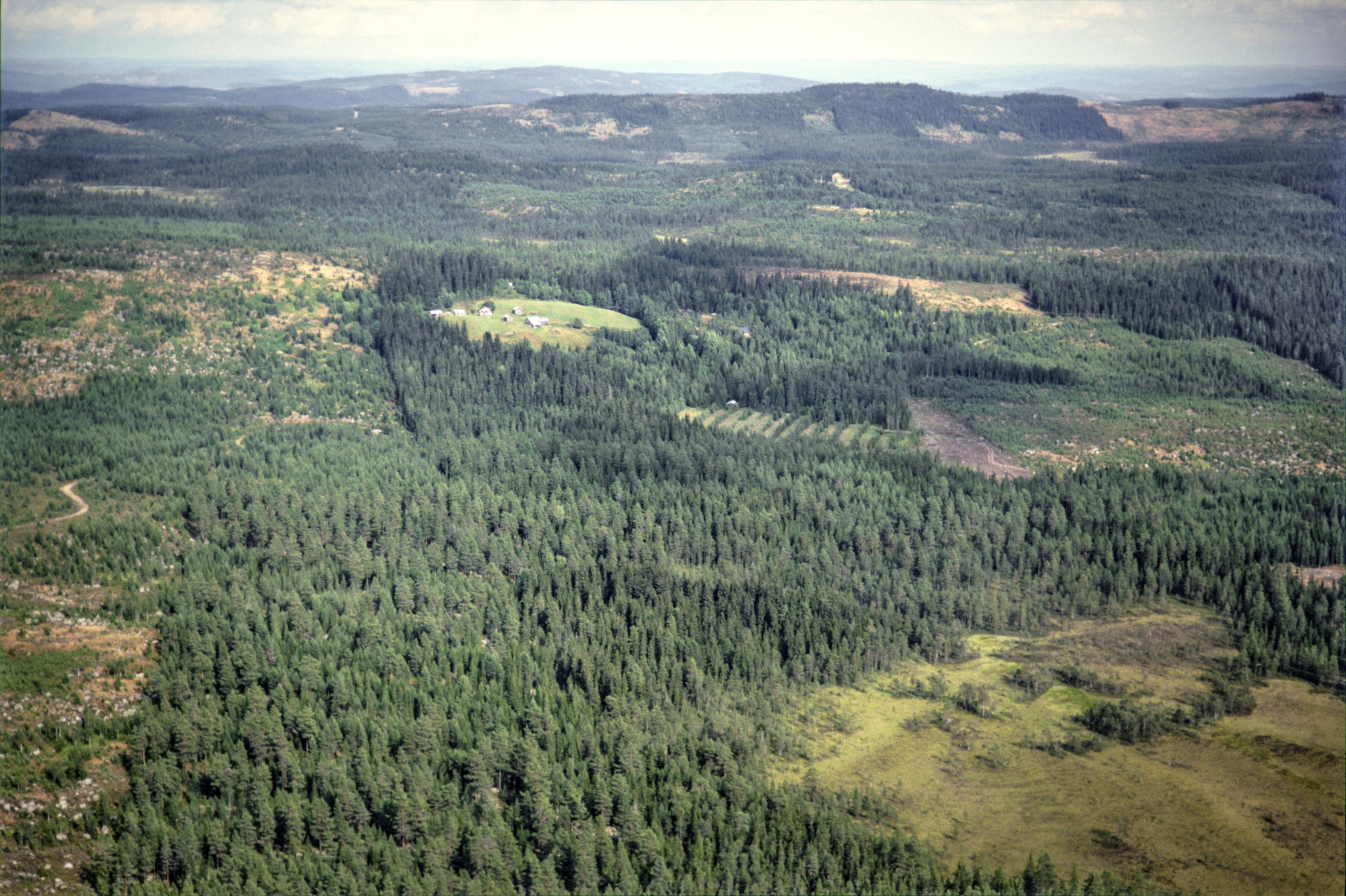 Beskrivning: Vid bildens mitt Kronhallen finngård. Vid gården tjärbränningsugn RAÄnr Lekvattnet 139:1. Bilden är tagen mot (väderstreck): Ö