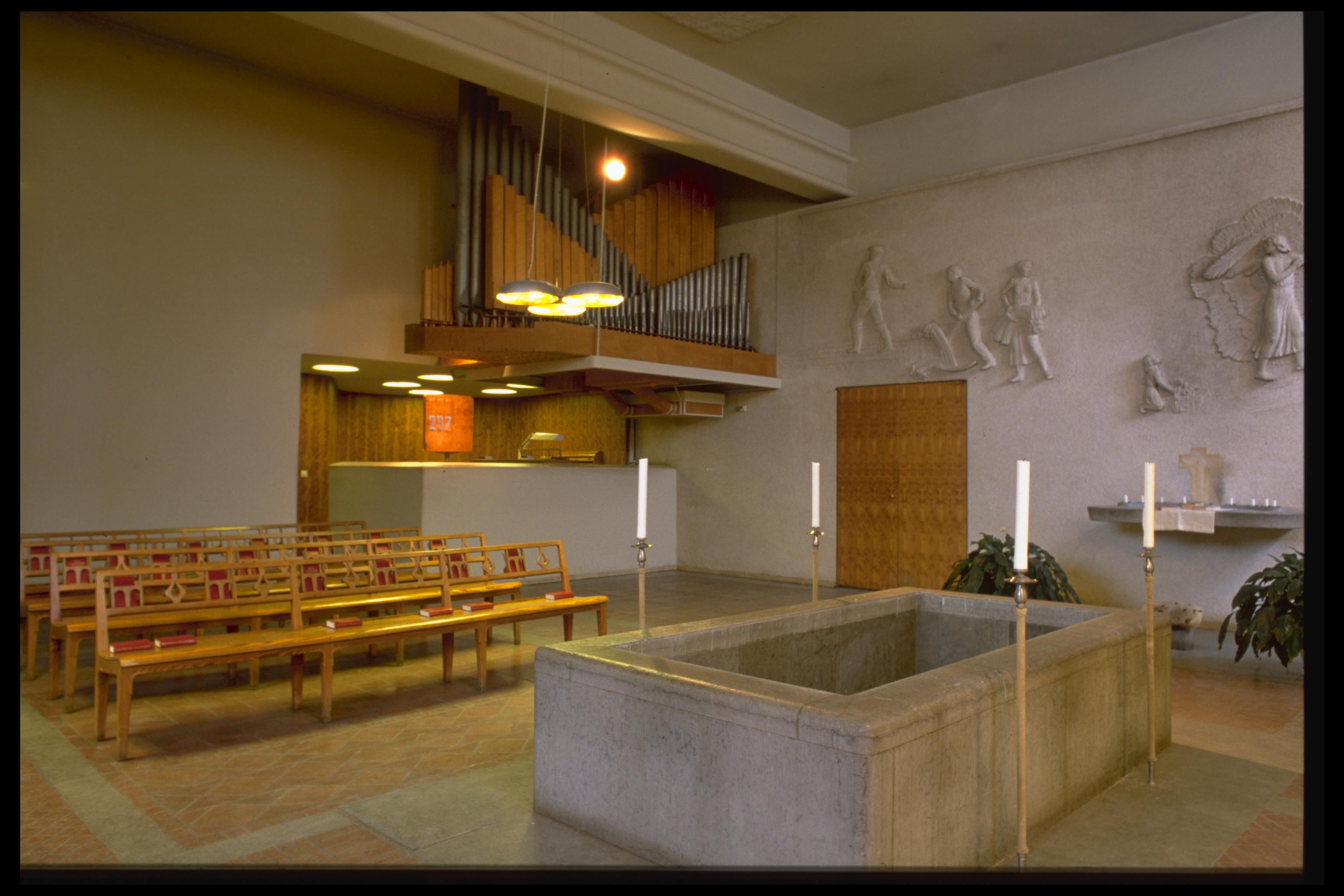 Beskrivning: Trons kapell, interiör. Orgelpartiet med bänkar och katafalken.