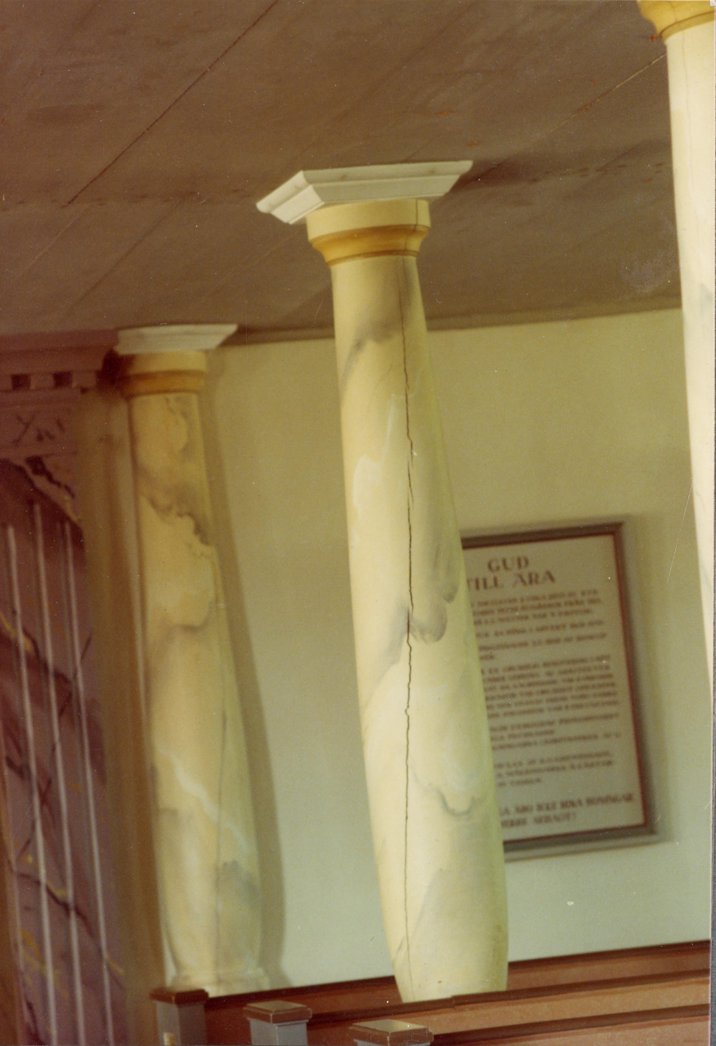 Beskrivning: Marmorerade pelare under orgelläktaren.