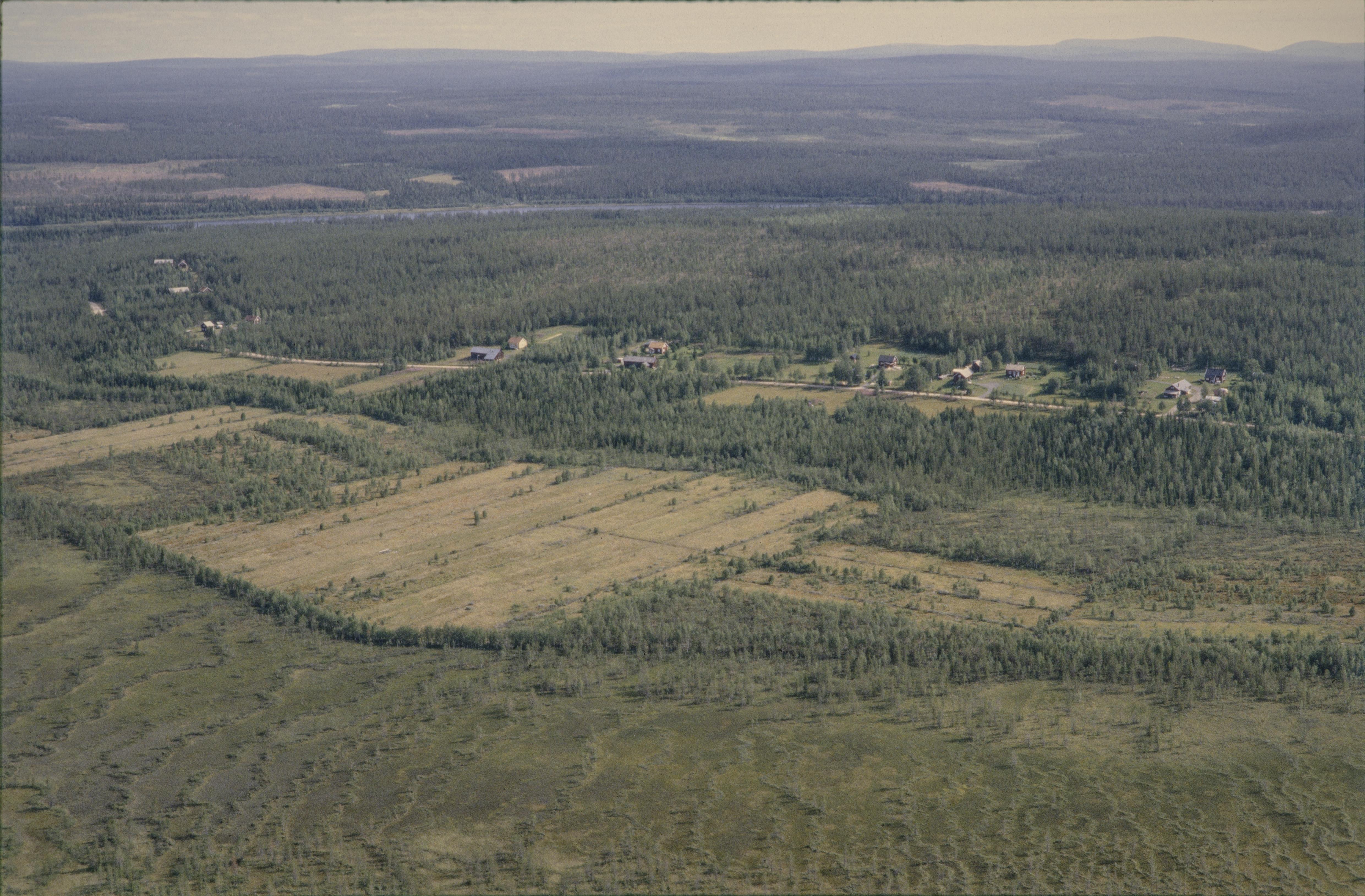 Beskrivning: Karnevaara by väster i Muonioälvens dalgång. Karnevaara är en skogsbruks- och jordbruksetablering i statlig regi. De 16 kolonaten från 1924 hade statligt byggda bostäder med kök, kammare och ladugård. Vid vägen till höger om bildens mitt renvall RAÄnr Pajala 675:1 och tegelindustri Pajala 674:1. Bilden är tagen mot (väderstreck): NO