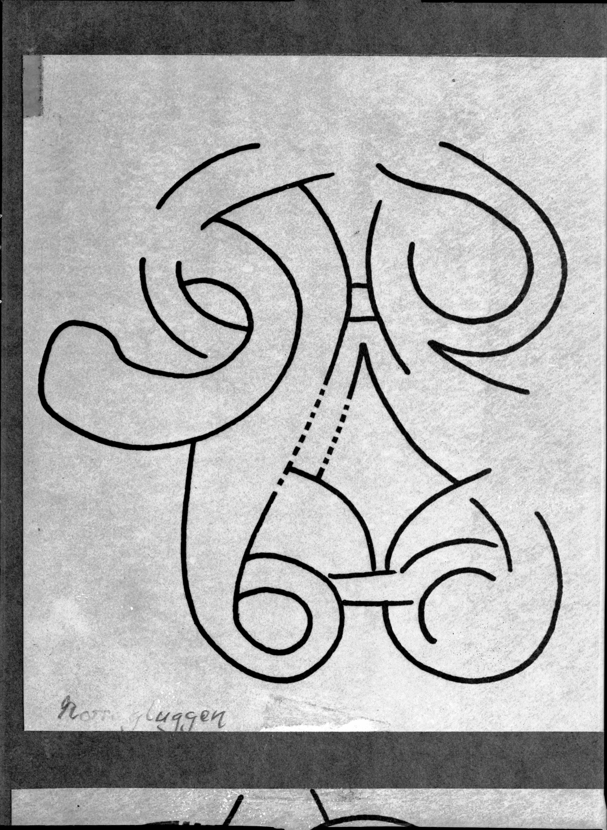 Beskrivning: Foto av av ritning av ornerad ekplanka i norra torngluggen.