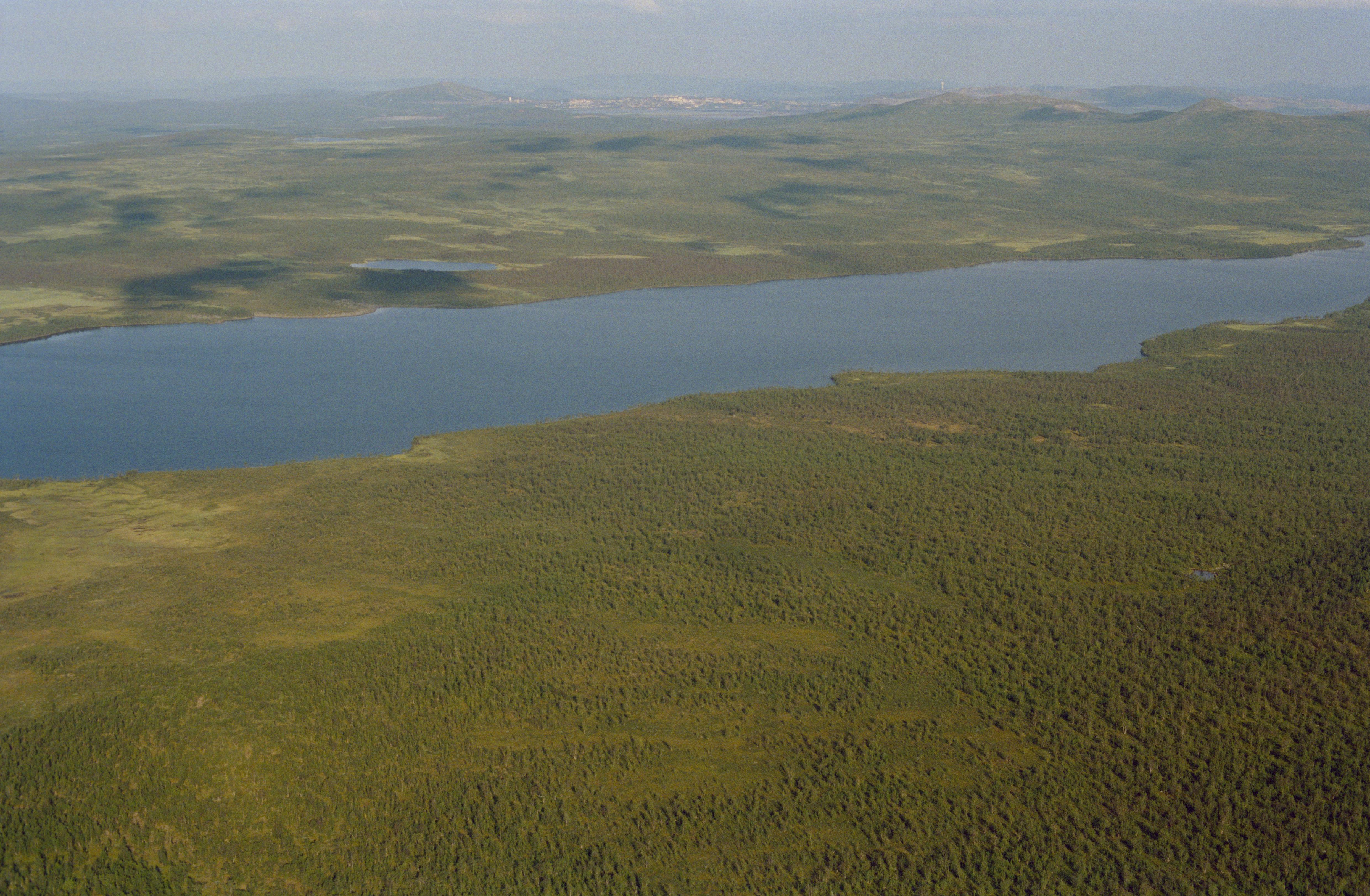Beskrivning: Sjön Eatnamjavri (Eatnamjávri) över bildens mitt. I bildens nedre del områden väster om sjön. Till höger om bildens mitt berget Huornás. På fjället Eatnamvárri uppe till höger offerplats RAÄnr Jukkasjärvi 72:1. Kiruna (Giron) tätort i bildens övre del. Bilden är tagen mot (väderstreck): Ö