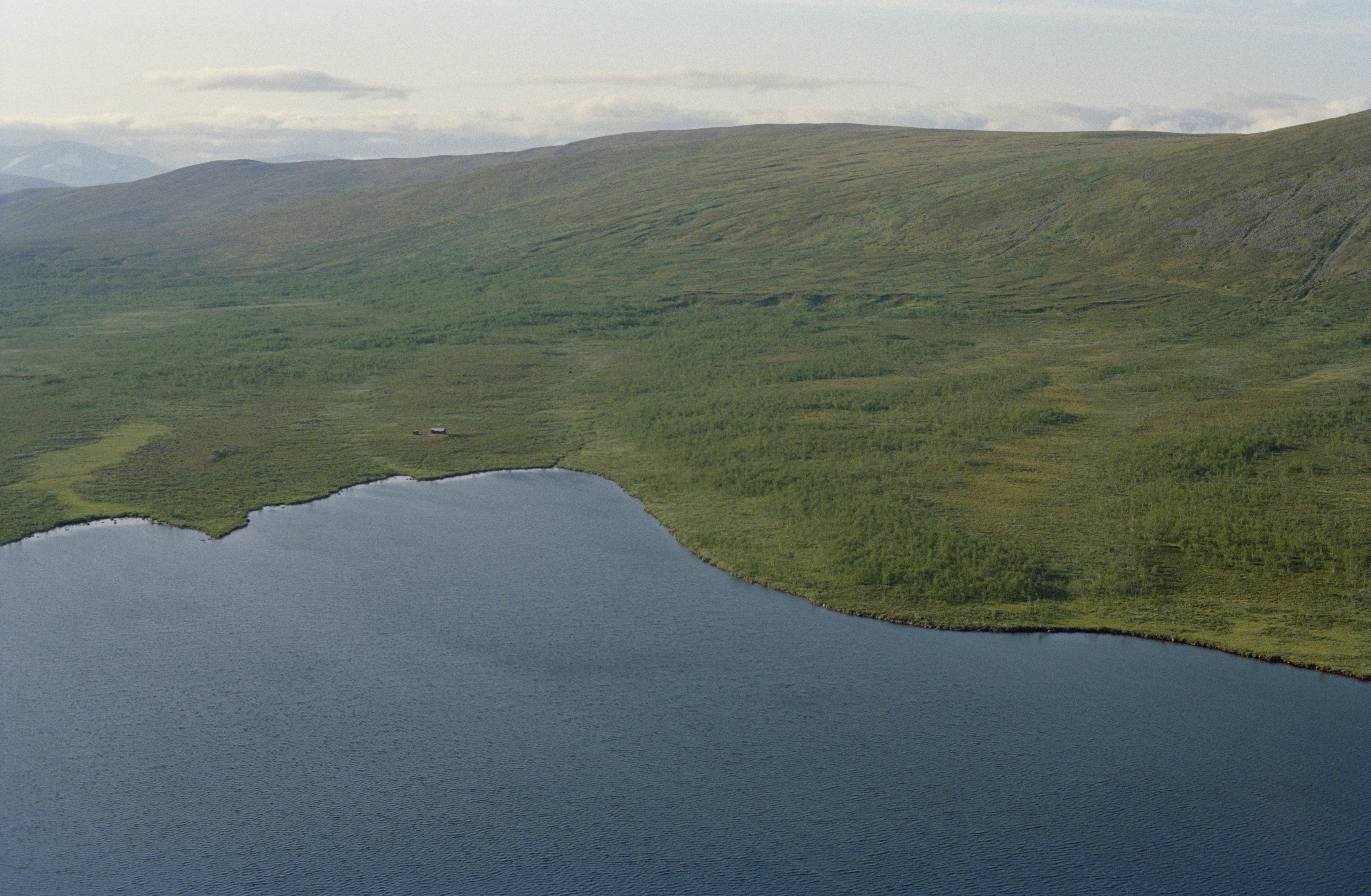 Beskrivning: Sjön Kiepanjaure (Giehpanjávri / Kiehpanjärvi). nordvästra ändan. Vid bildens mitt en renvaktarstuga. Till höger i bildens övre del berget Stuor Tuoipal. Bilden är tagen mot (väderstreck): N