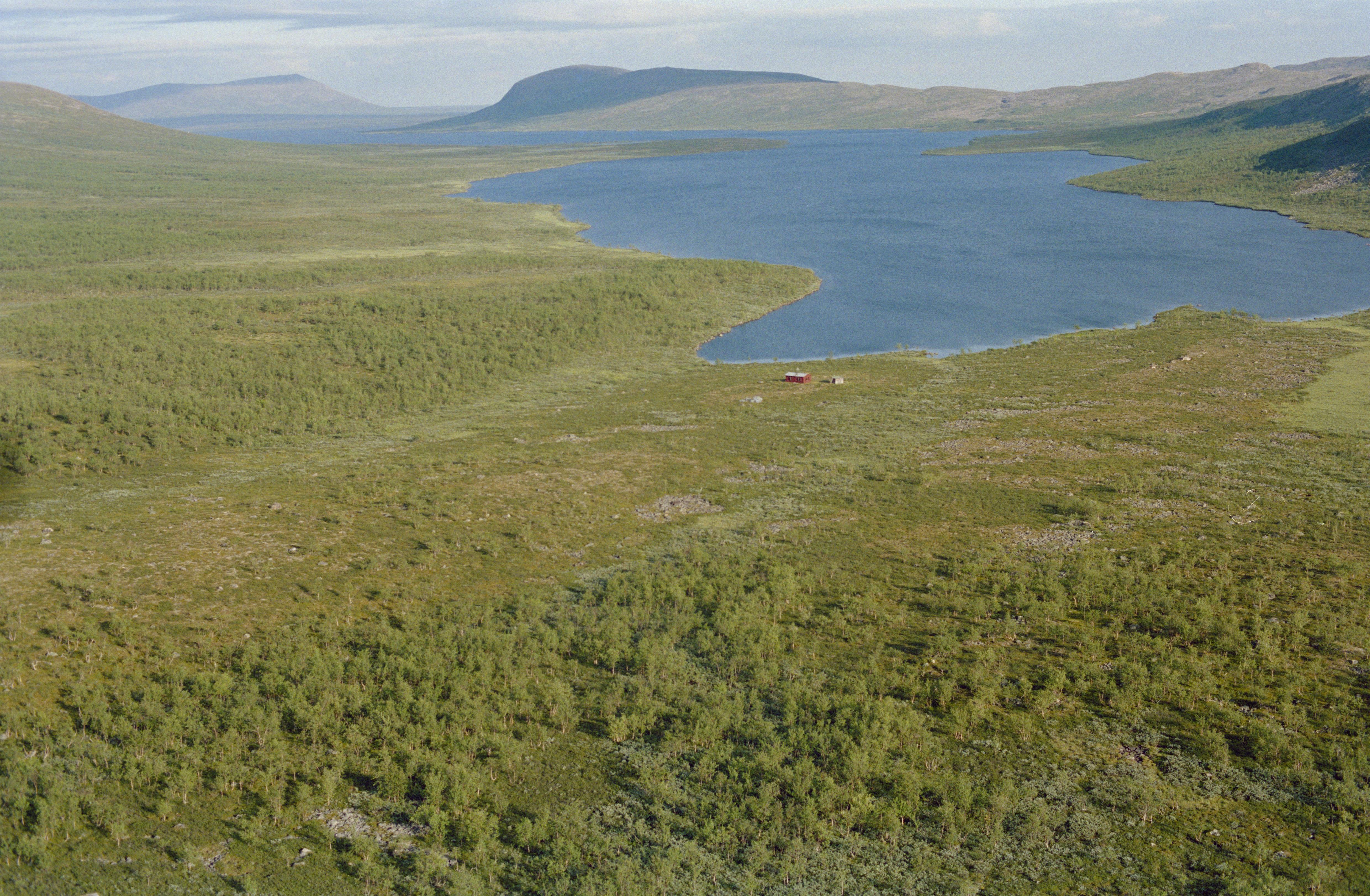 Beskrivning: Sjön Kiepanjaure (Giehpanjávri / Kiehpanjärvi). nordvästra ändan vid berget Stuor Tuoipal. Vid bildens mitt en renvaktarstuga. Till höger i bildens övre del berget Darfál. Bilden är tagen mot (väderstreck): OSO
