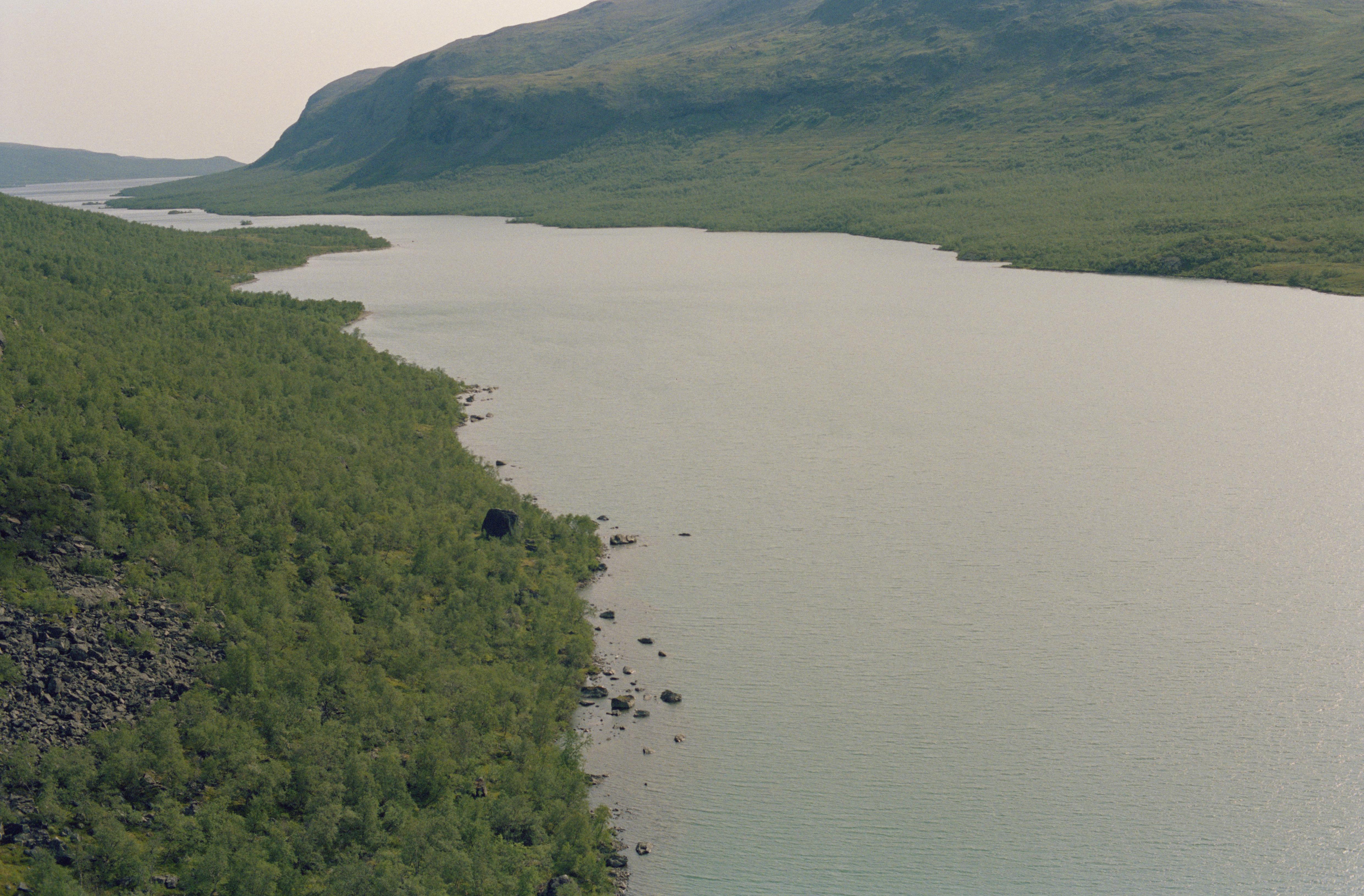Beskrivning: Sjön Rautasjaure (Rávttasjávri). Till vänster i bildens övre del sundet Coalbmi vid bergen Várregaska och Lulip Vealevárri. Nere till vänster offerplats RAÄnr Jukkasjärvi 172:1 vid stenen Jukkasjärvi 173:1. Bilden är tagen mot (väderstreck): SSO