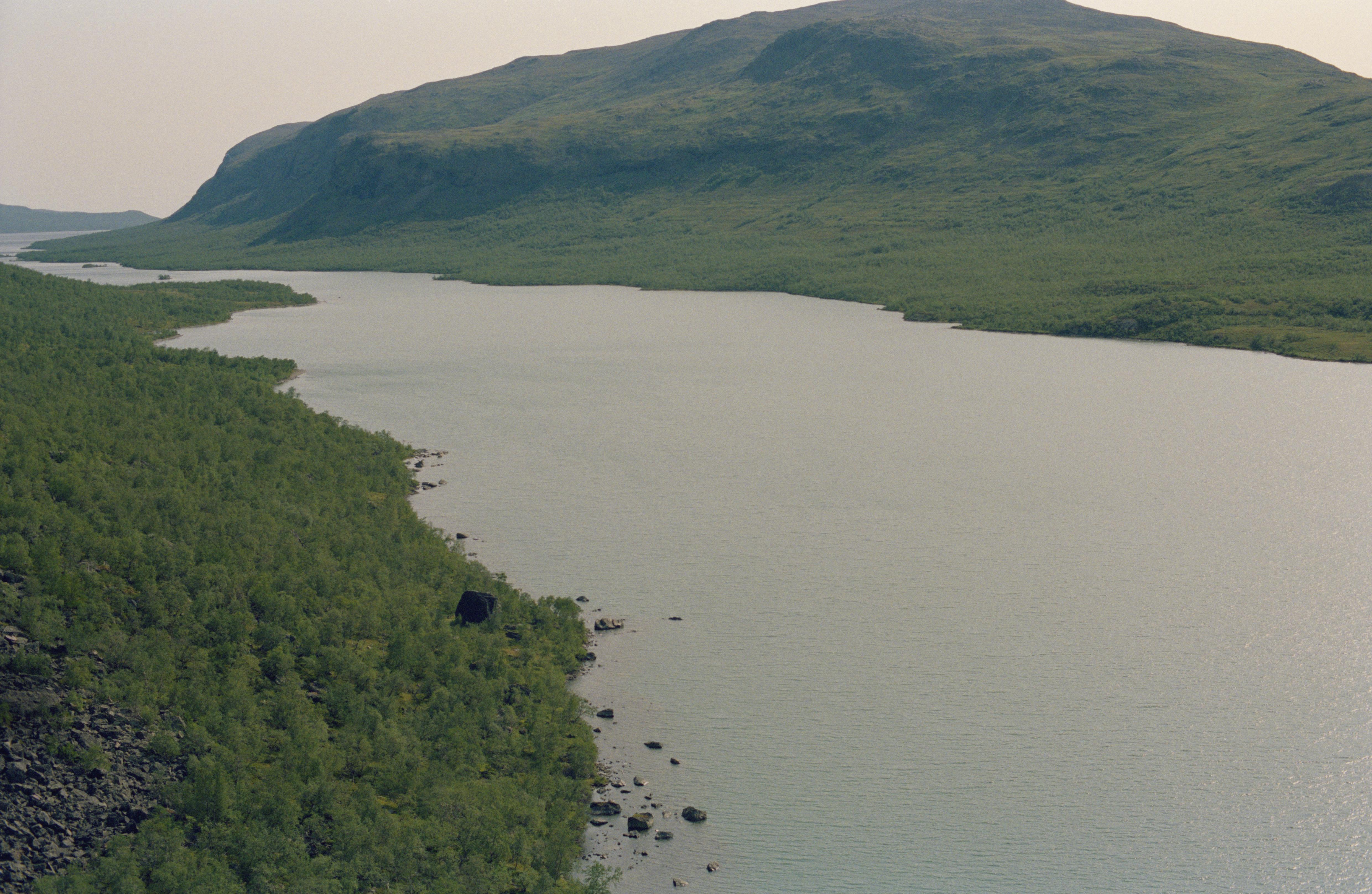 Beskrivning: Sjön Rautasjaure (Rávttasjávri). Till vänster i bildens övre del sundet Coalbmi vid bergen Várregaska och Lulip Vealevárri. Nere till vänster offerplats RAÄnr Jukkasjärvi 172:1 vid stenen Jukkasjärvi 173:1. Bilden är tagen mot (väderstreck): SSO