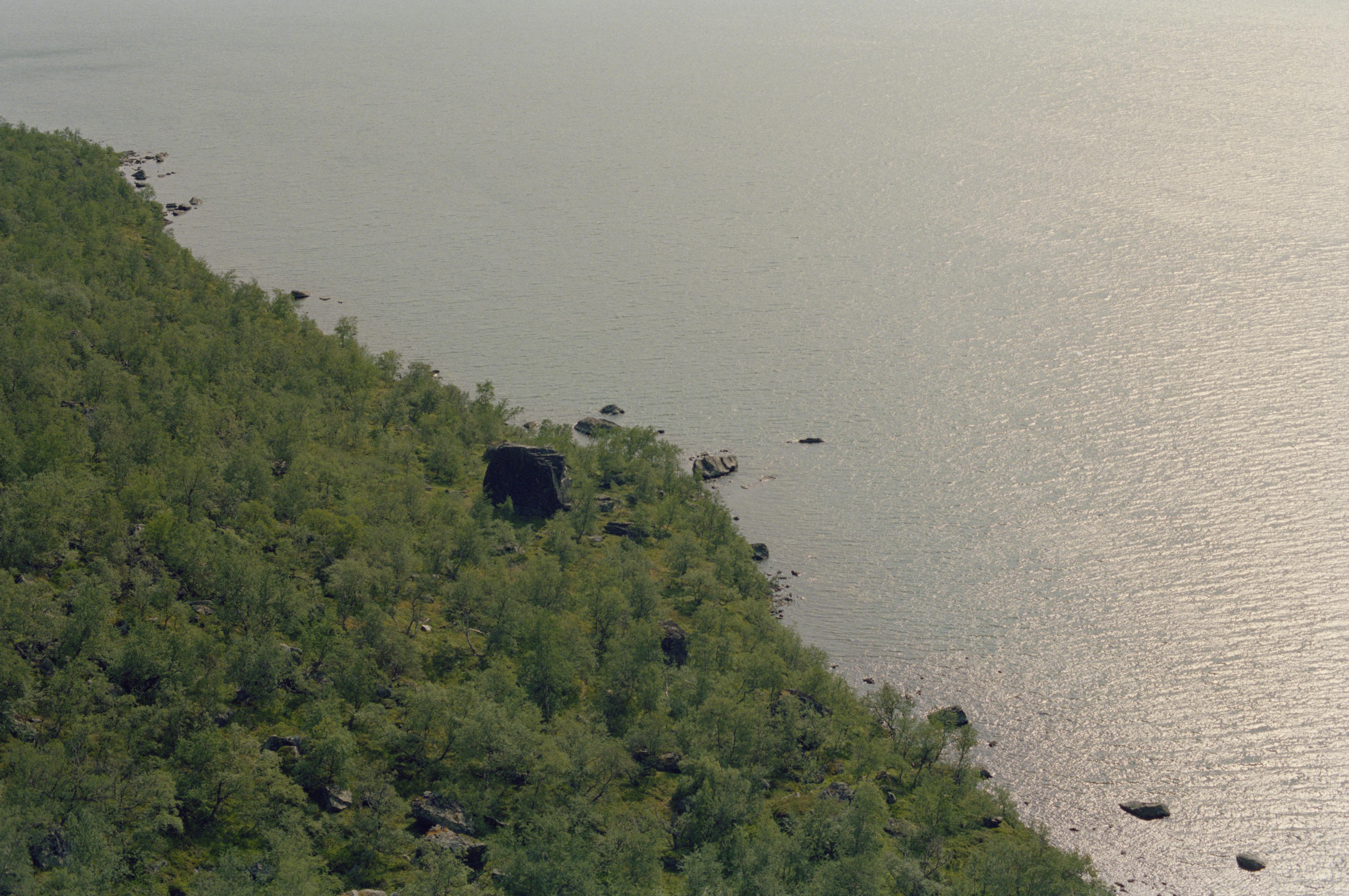 Beskrivning: Sjön Rautasjaure (Rávttasjávri), söder om sundet Coalbmi. I bildens nedre del offerplats RAÄnr Jukkasjärvi 172:1 vid stenen Jukkasjärvi 173:1. Bilden är tagen mot (väderstreck): S
