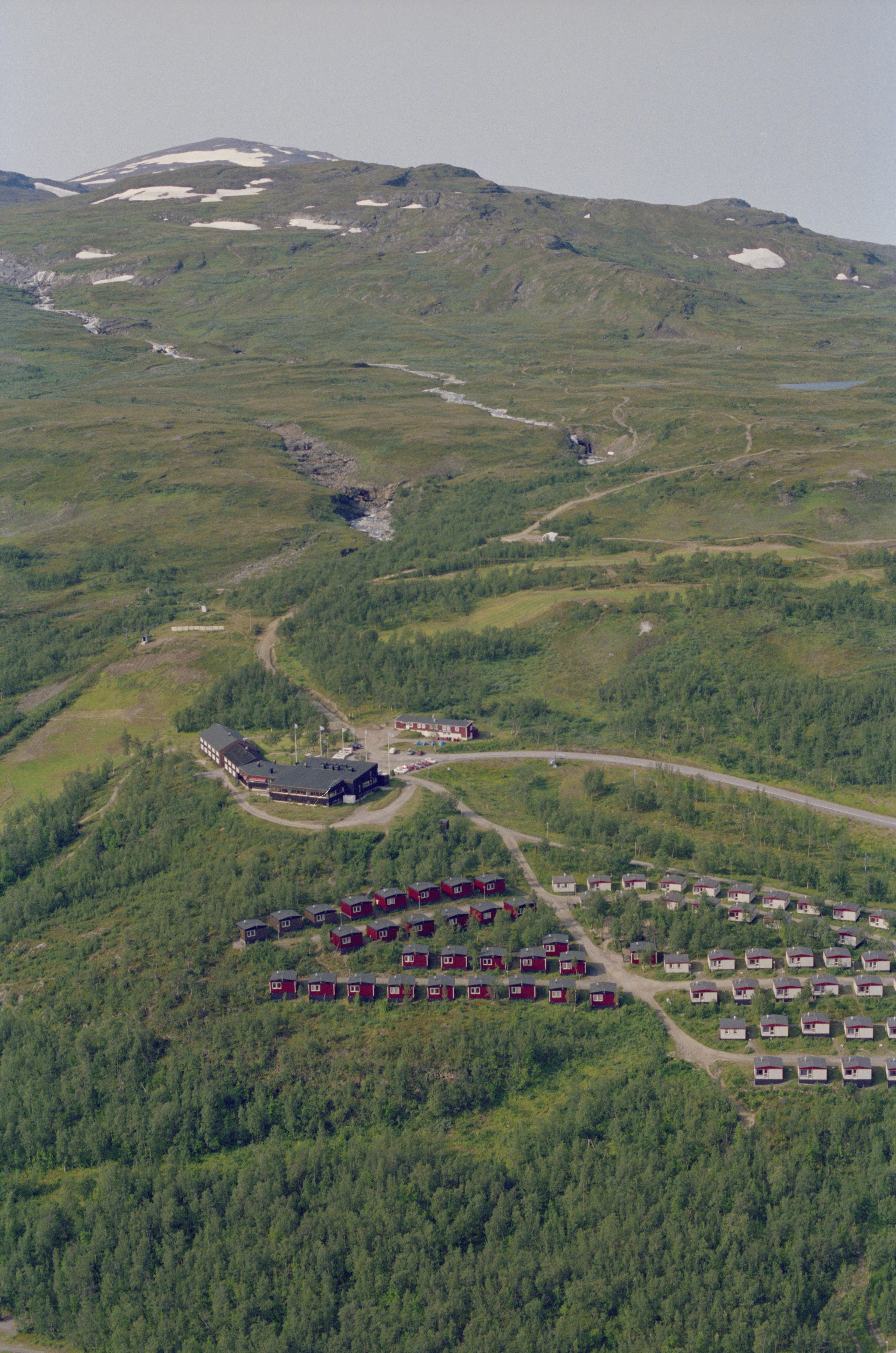 Beskrivning: Turistorten Björkliden med järnvägsstation, turiststation, turisthotell, skidbacke, golfbana, m.m vid sjön Torneträsk (Duortnosjávri). Björklidens turisthotell och turiststation vid bildens mitt. Bilden är tagen mot (väderstreck): V