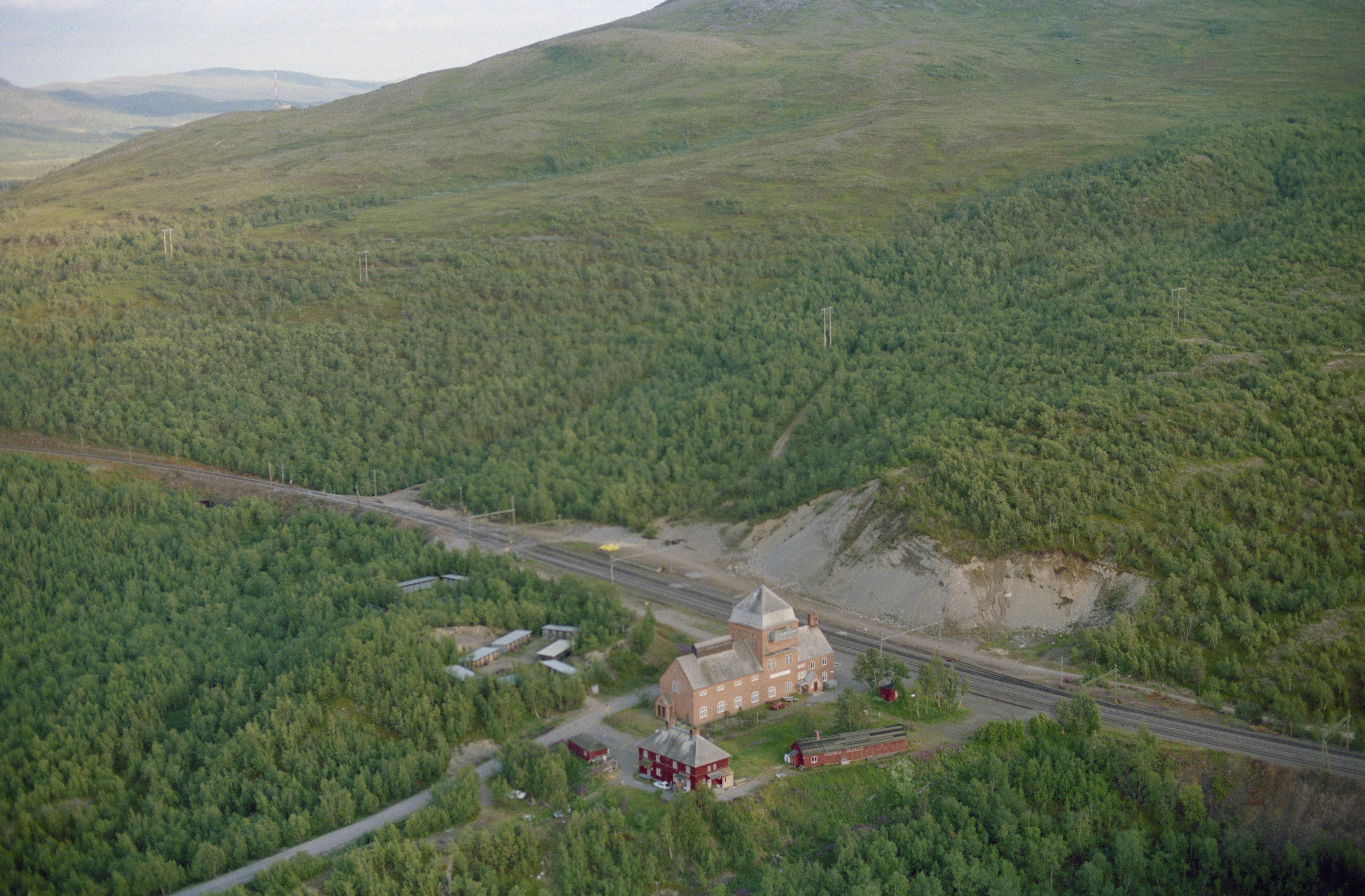 Beskrivning: Torneträsk järnvägsstation vid järnvägen Ofotbanen (Ofotbanan / Malmbanan). I skogen över bildens mitt område med härdar och kåta RAÄnr Jukkasjärvi 877:1-5. Området är norr om sjön Torneträsk (Duortnosjávri). Bilden är tagen mot (väderstreck): SO