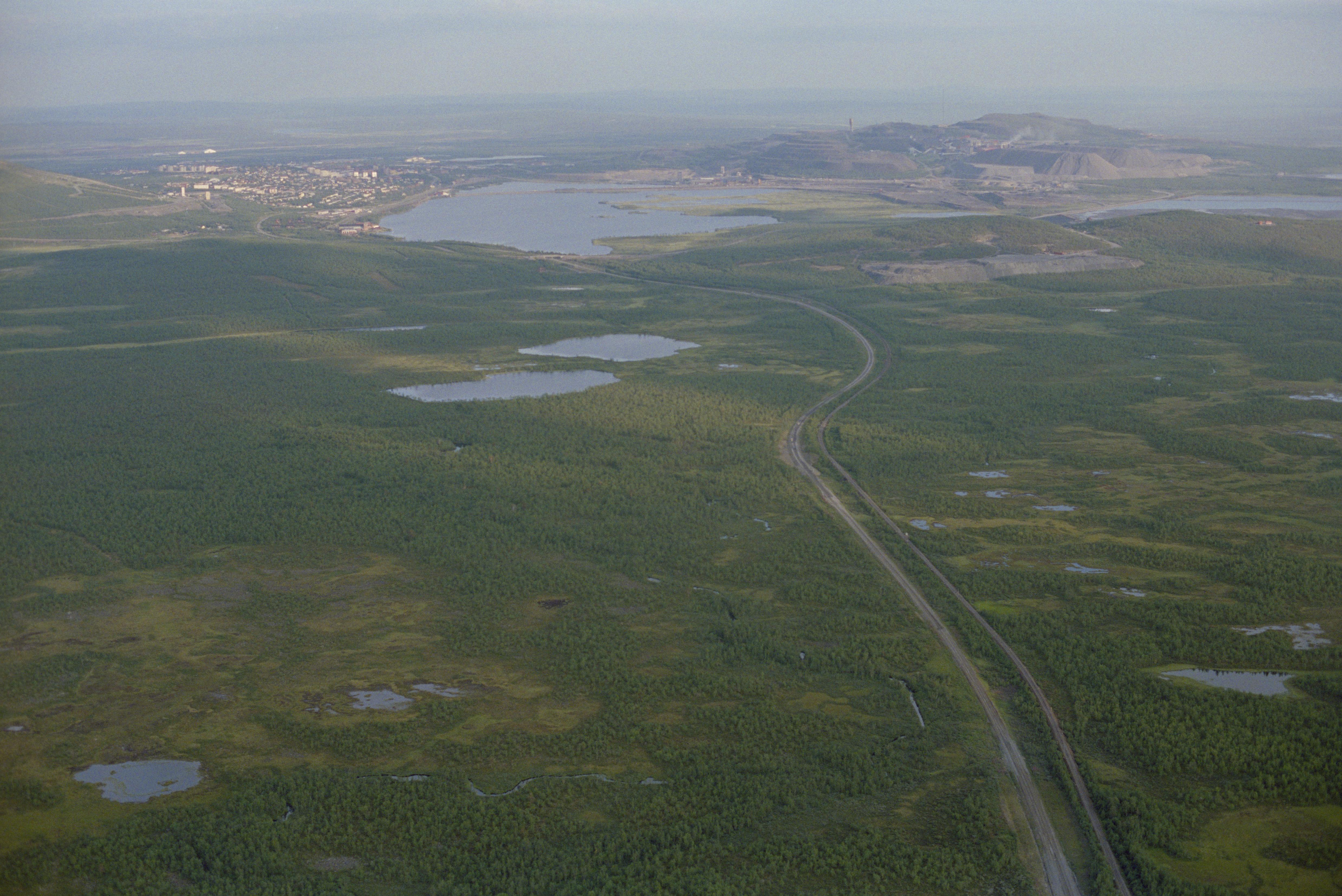 Beskrivning: Järnvägen Ofotbanen (Ofotbanan / Malmbanan) mellan Norge och Sverige i området vid Krokvik. I bildens nedre del Tiansbäcken (Vuonajohka). I bildens övre del tätorten och gruvsamhället Kiruna (Giron). Till vänster om bildens mitt gruvhål RAÄnr Jukkasjärvi 2260, m.m. Bilden är tagen mot (väderstreck): SO
