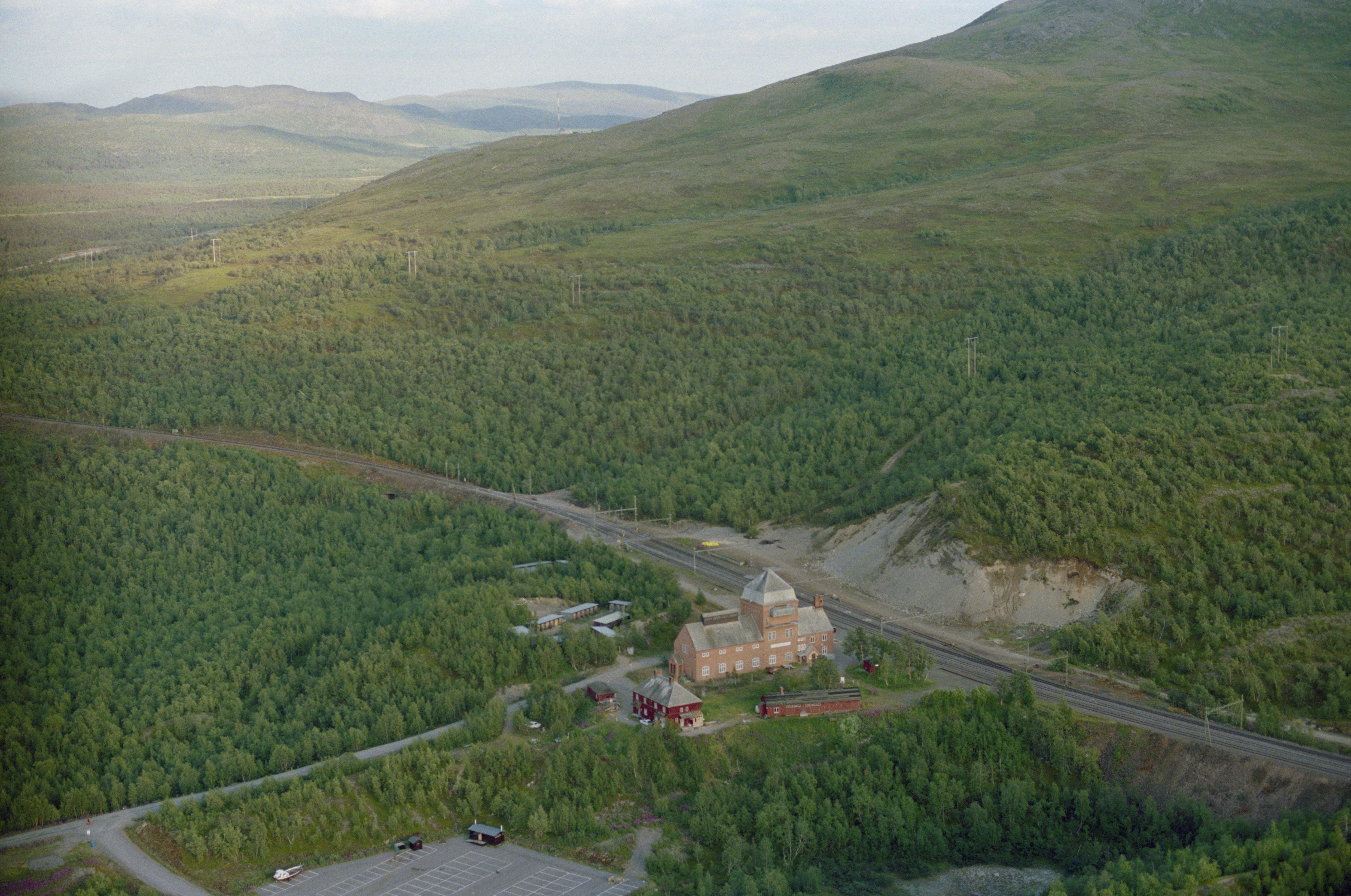 Beskrivning: Torneträsk järnvägsstation vid järnvägen Ofotbanen (Ofotbanan / Malmbanan). I skogen över bildens mitt område med härdar och kåta RAÄnr Jukkasjärvi 877:1-5. Området är norr om sjön Torneträsk (Duortnosjávri). Bilden är tagen mot (väderstreck): SO