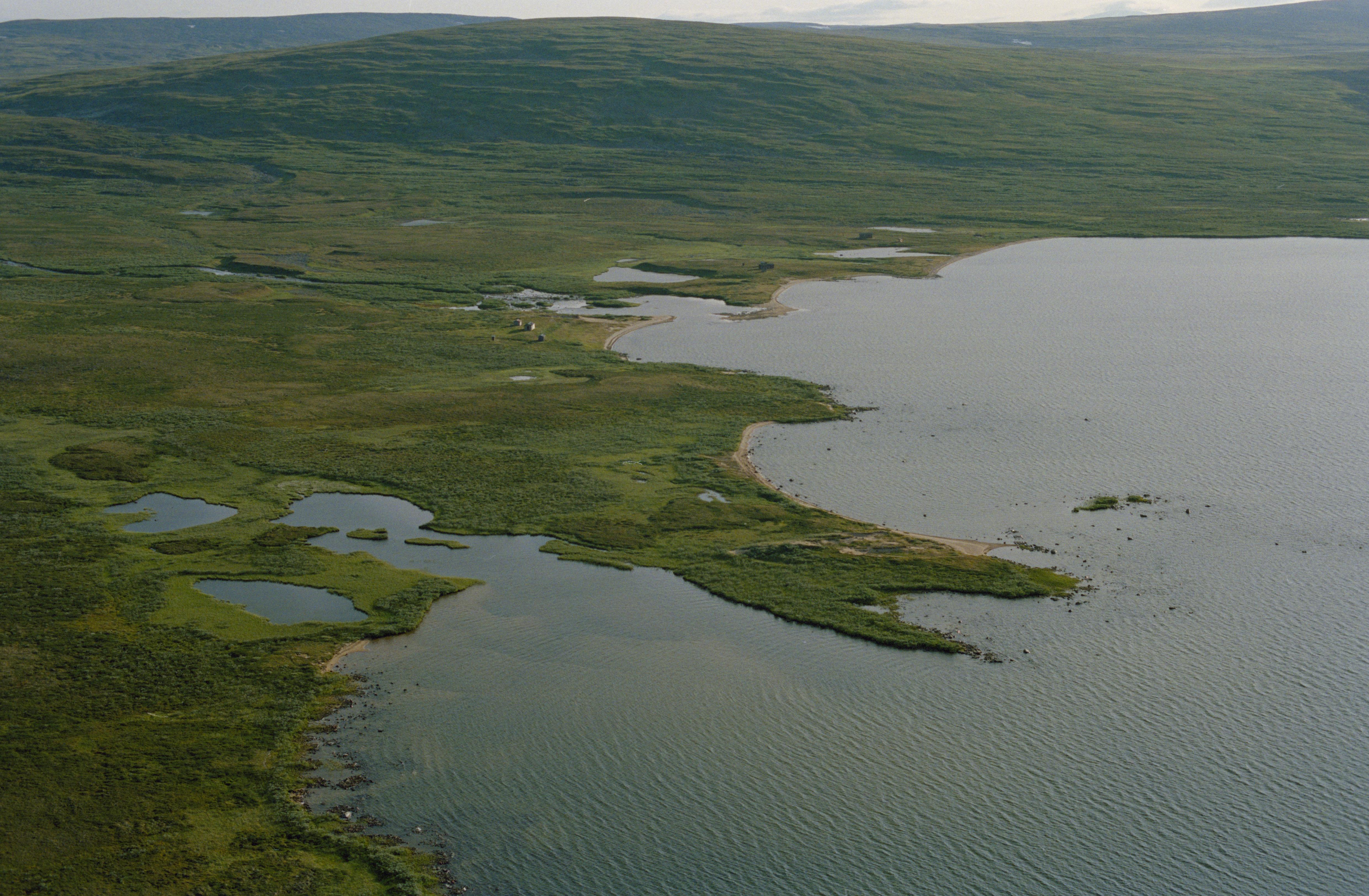 Beskrivning: Sjön Råstojaure (Rostojávri / Rostojärvi). Till vänster om bildens mitt stugor / viste vid näset Sorrinjarga (Sorrinjárga) på södra stranden. Vid näset boplats RAÄnr Karesuando 911, 915, härd Karesuando 913, 916, m.m. Bilden är tagen mot (väderstreck): SV