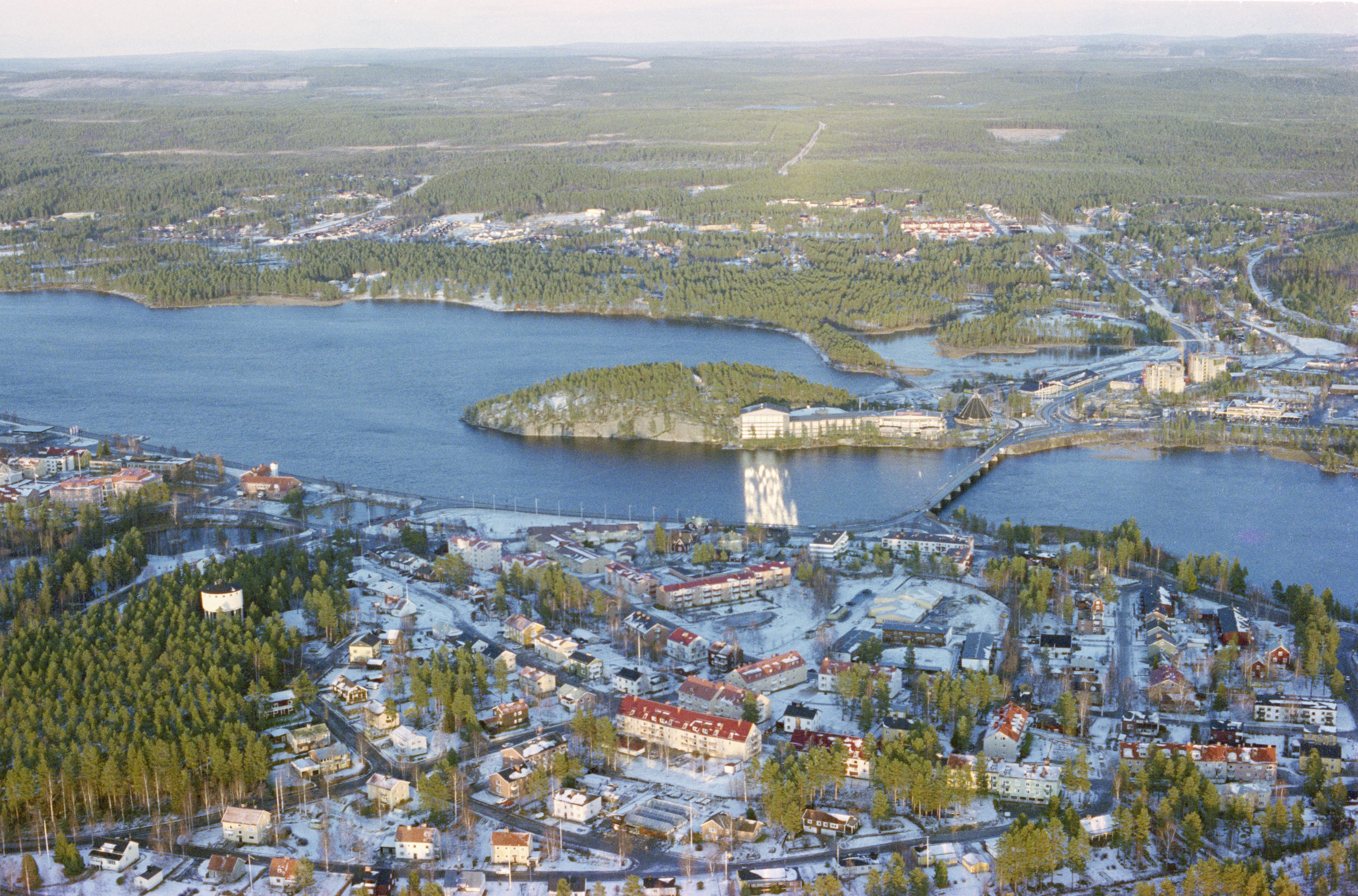Beskrivning: Beskrivning: Umeälven vid Lycksele tätort. I bildens mitt udden Korpberget med hällmålning RAÄnr Lycksele 301:1. Bilden är tagen mot (väderstreck): ONO Fotosyfte: Flygbildsdokumentation