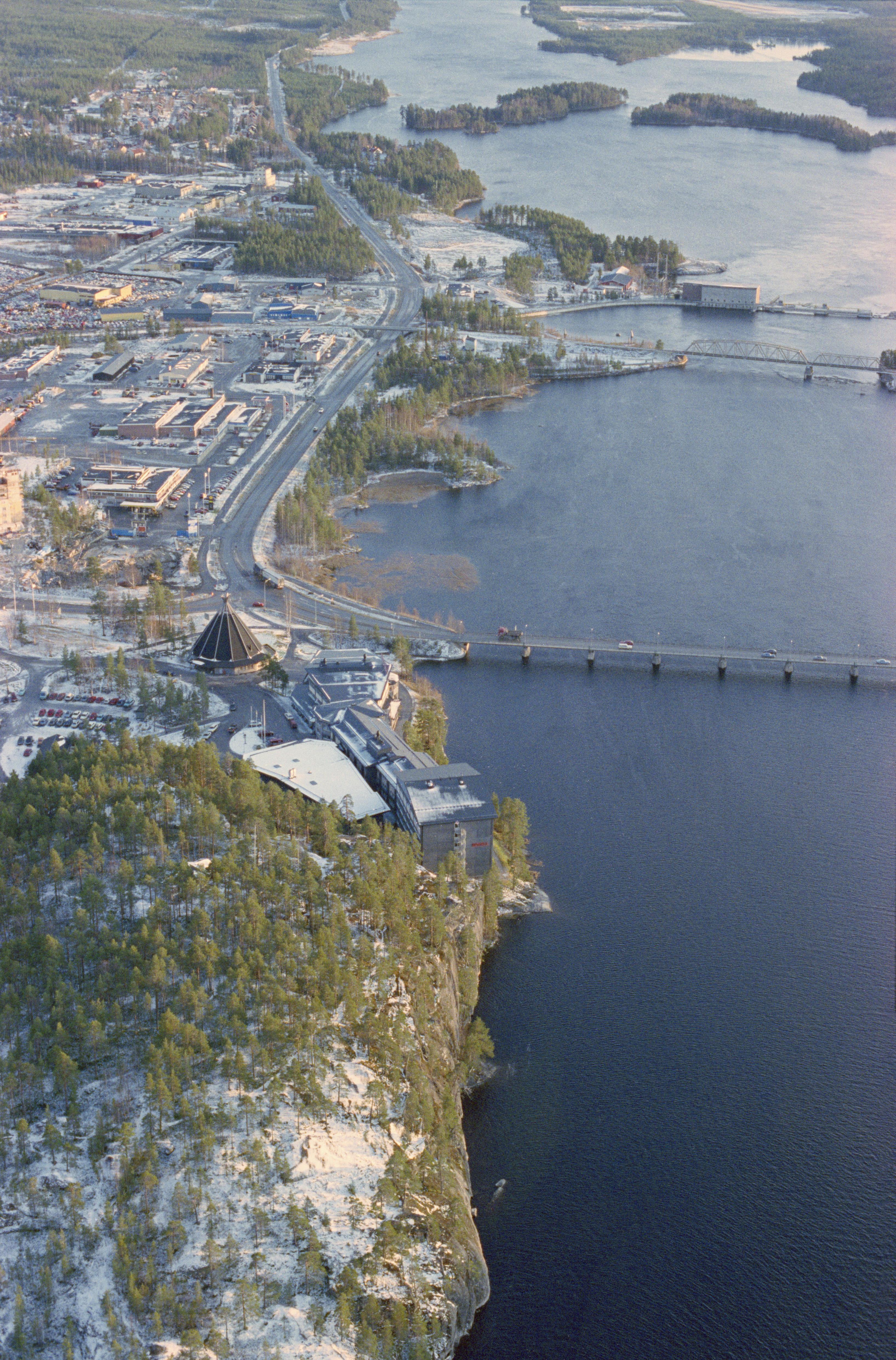 Beskrivning: Umeälven vid Lycksele tätort. Till vänster under bildens mitt udden Korpberget. Till höger på Korpberget hällmålning RAÄnr Lycksele 301:1. Vid järnvägsbron uppe till höger boplats Lycksele 110:1. Bilden är tagen mot (väderstreck): SSO