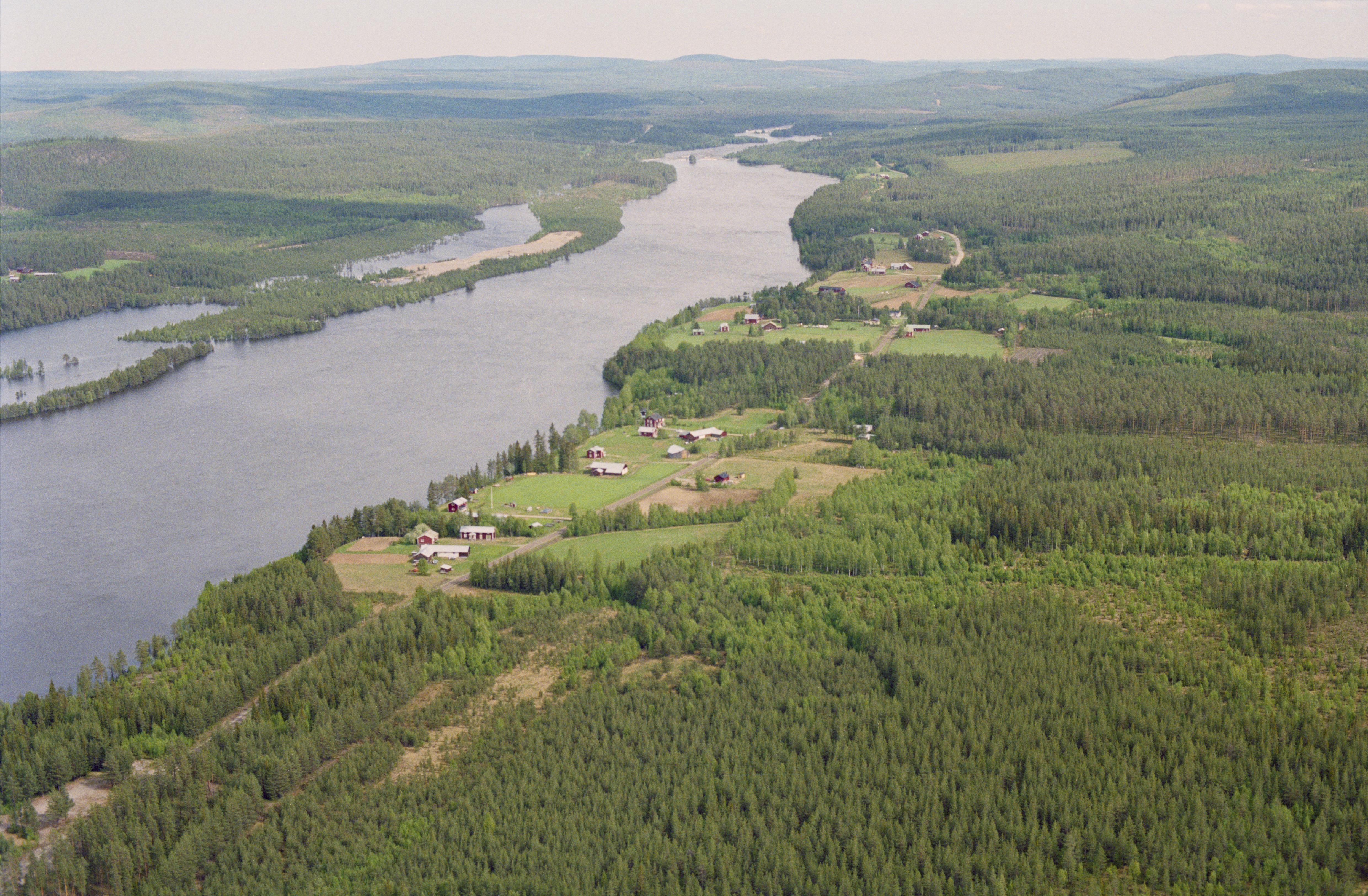 Beskrivning: Siksele by vid Vindelälven (Vidduoljiennuo). Vid älvkanten uppe till vänster boplats RAÄnr Lycksele 295:1, 296:1 m.fl. söder om Mastakluddens naturreservat. I bildens övre del Sikseleforsen i Degerfors socken, landskapet Västerbotten. Bilden är tagen mot (väderstreck): OSO