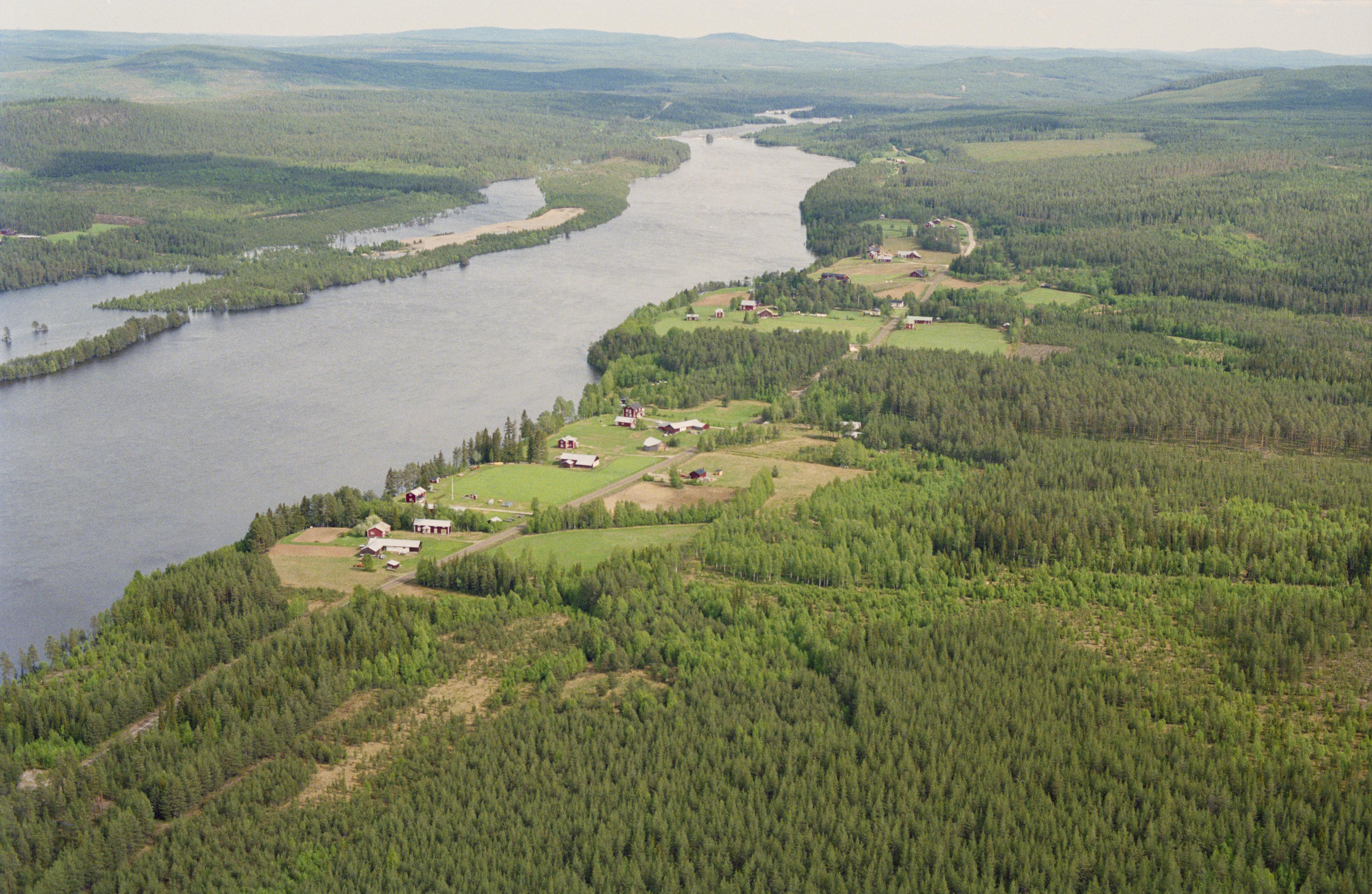 Beskrivning: Siksele by vid Vindelälven (Vidduoljiennuo). Vid älvkanten uppe till vänster boplats RAÄnr Lycksele 295:1, 296:1 m.fl. söder om Mastakluddens naturreservat. I bildens övre del Sikseleforsen i Degerfors socken, landskapet Västerbotten. Bilden är tagen mot (väderstreck): OSO