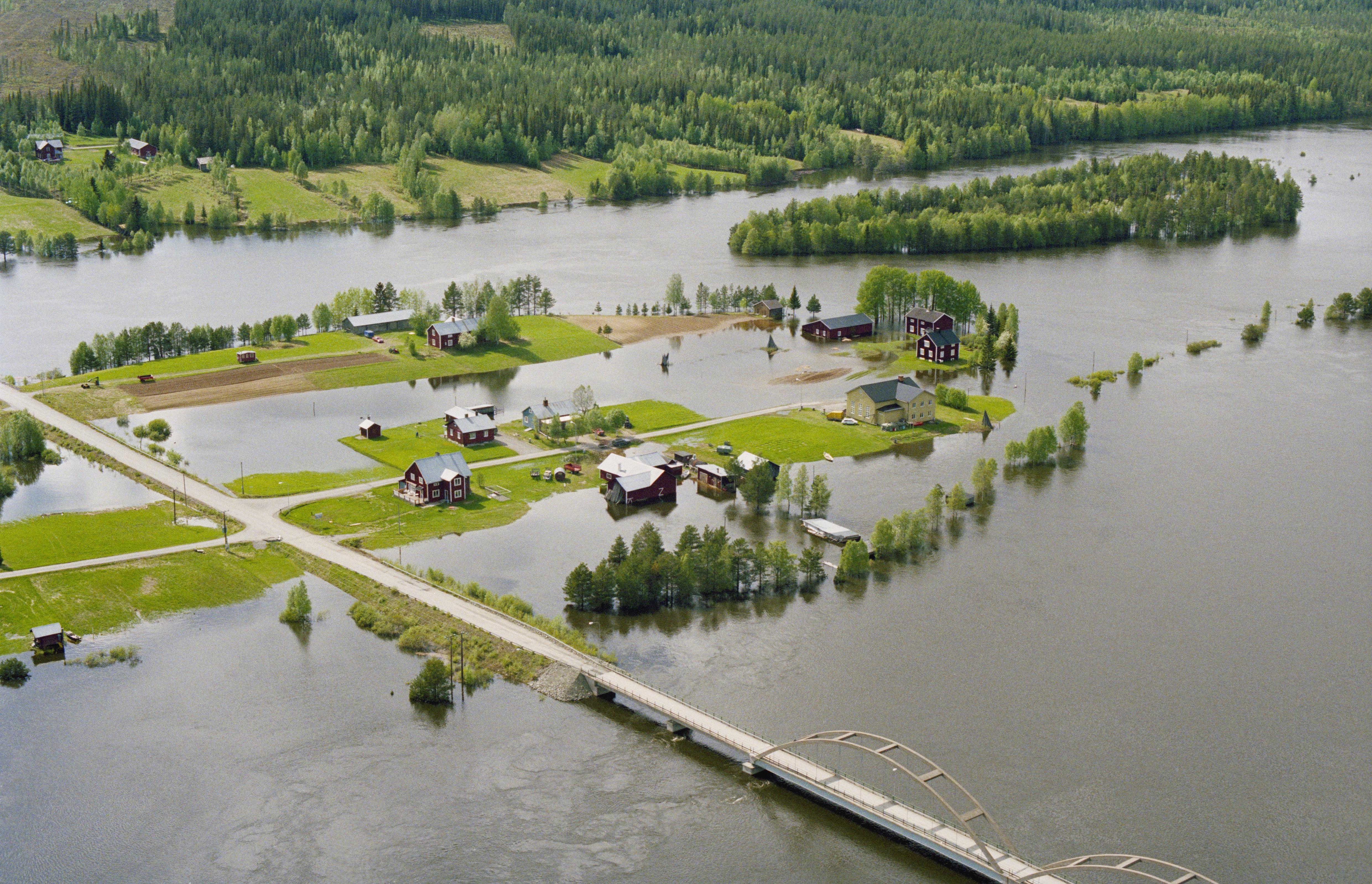 Beskrivning: Vindelälven (Vidduoljiennuo) vid Vindelgransele by (Krániesuvvane). På Brännholmen (mellan broarna till vänster) ett sameviste RAÄnr Lycksele 1526:1. Området är här delvis översvämmat efter vårfloden. Bilden är tagen mot (väderstreck): V
