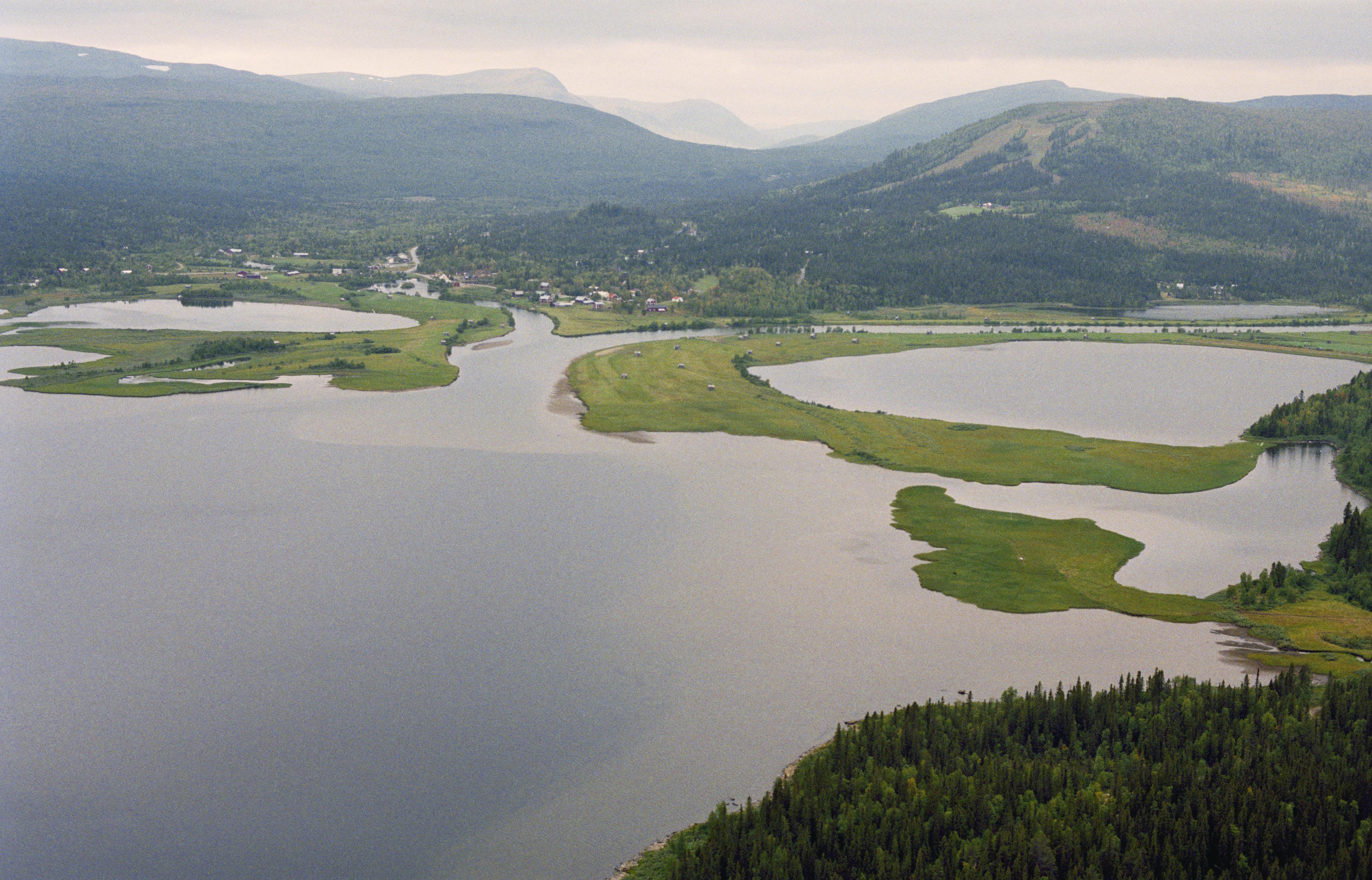 Beskrivning: Deltalandskapet där Tjulån och Vindelälven (Vidduoljiennuo) möts i sjön Gautsträsket (Gávtjávrrie). I bildens övre del Ammarnäs kyrkby (Gávtjávrrie) på Ammarnäset. Ammarnäs kyrka/kapel RAÄnr Sorsele 776:1 vid kullen Potatisbacken över bildens mitt. Bilden är tagen mot (väderstreck): SV