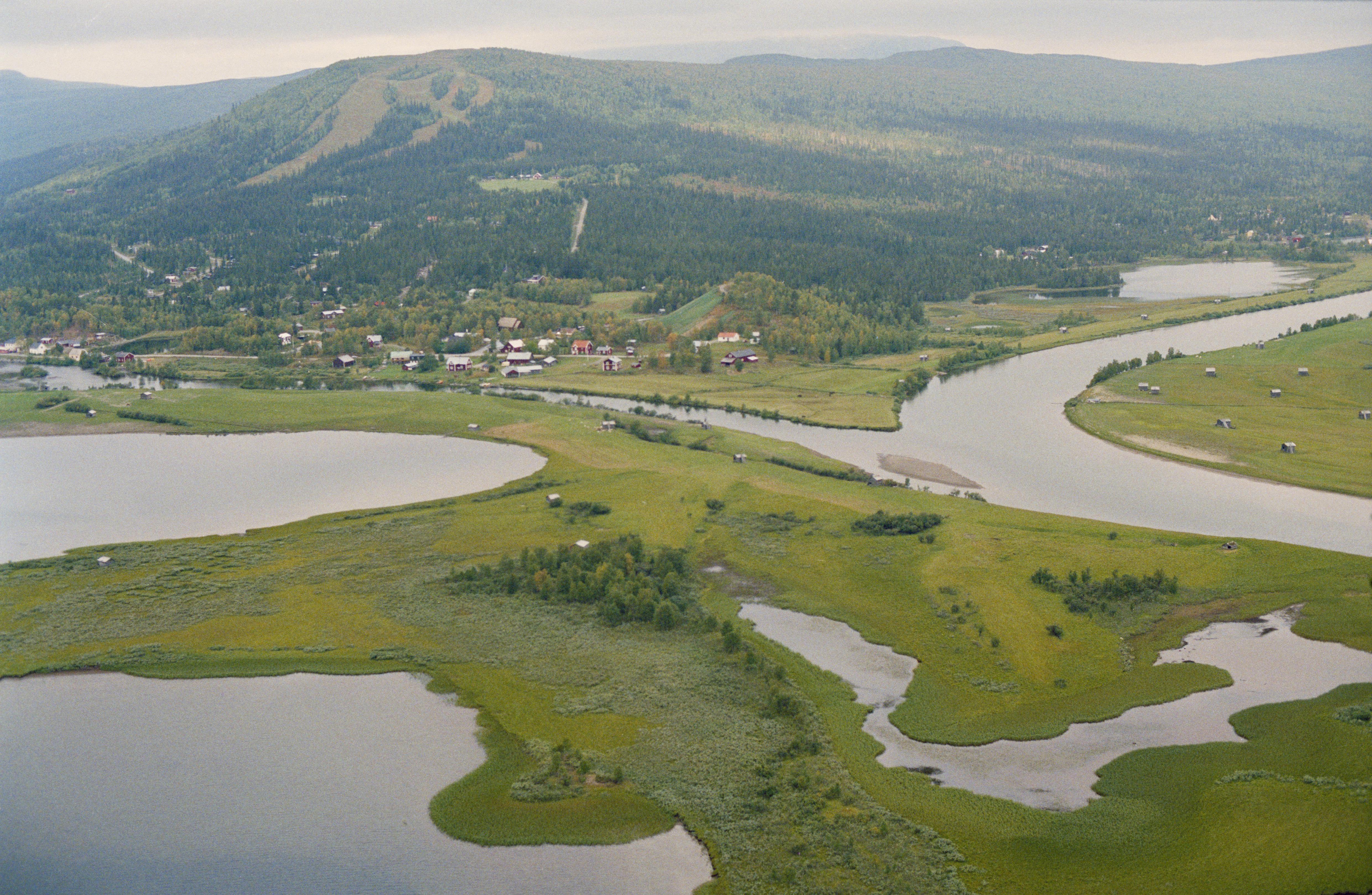 Beskrivning: Deltalandskapet där Tjulån och Vindelälven (Vidduoljiennuo) möts i sjön Gautsträsket (Gávtjávrrie). I bildens övre del Ammarnäs kyrkby (Gávtjávrrie) på Ammarnäset. Ammarnäs kyrka/kapel RAÄnr Sorsele 776:1 vid kullen Potatisbacken över bildens mitt. Bilden är tagen mot (väderstreck): NV