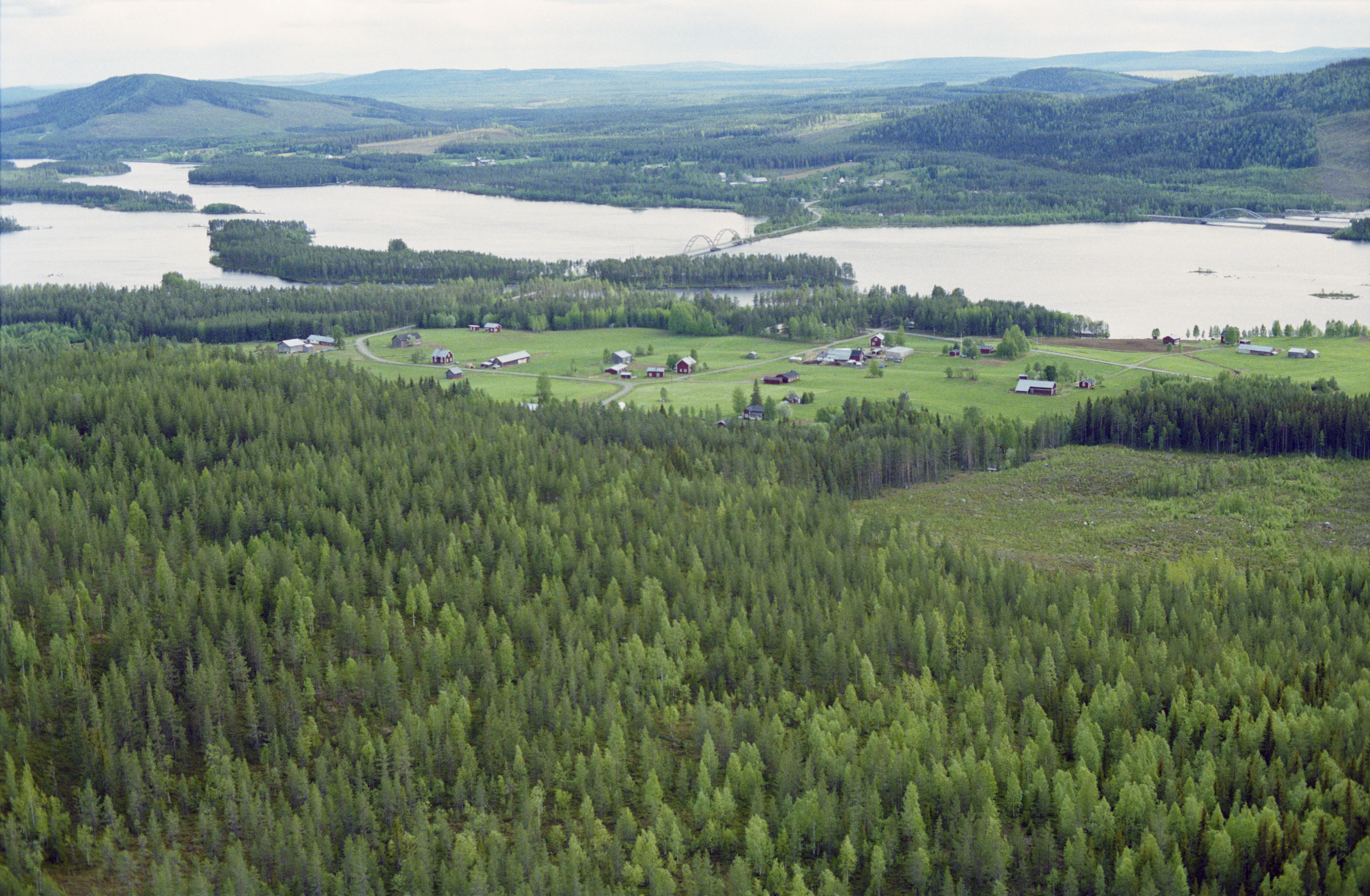 Beskrivning: Åskiljeby (Geäddiedievvá) vid sjön Åskilje (Jeanoejåakoe) där Umeälven sammanflöder med Juktån. Vid bildens mitt boplats RAÄnr Stensele 50:1 m.fl. Åskilje kyrka skymtar mellan broarna till höger i bildens övre del. Bilden är tagen mot (väderstreck): S