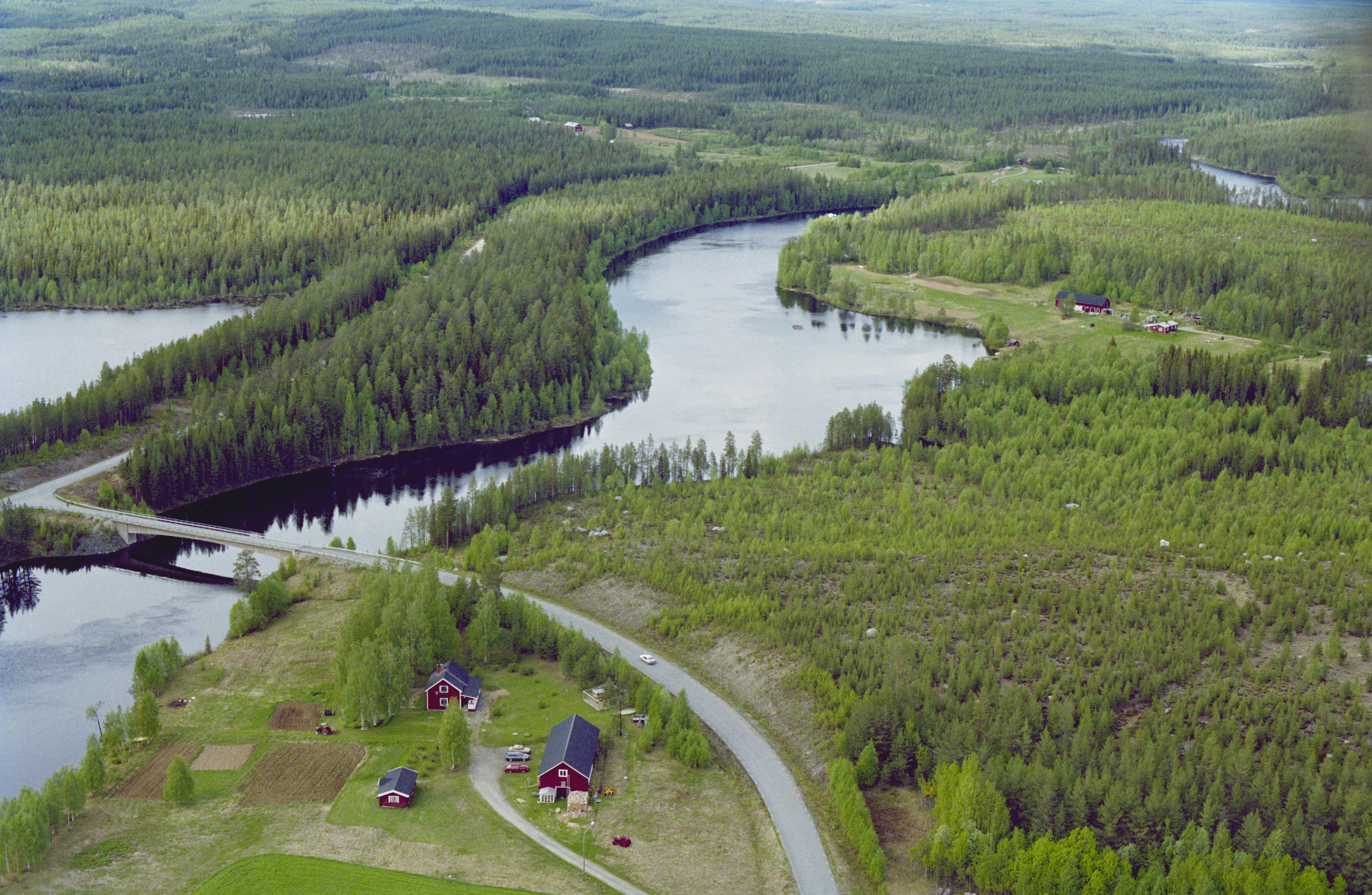 Beskrivning: I bildens nedre del området Strängnäs på östsidan av Juktån. Nere till vänster ett av torpen i Juktåkolonin som är en grupp kronolägenheter / torp i områdena vid Juktån och orten Gunnarn. Till höger om bildens mitt boplats RAÄnr Stensele 1162 m.fl. och torpet Gustavsborg. Bilden är tagen mot (väderstreck): N