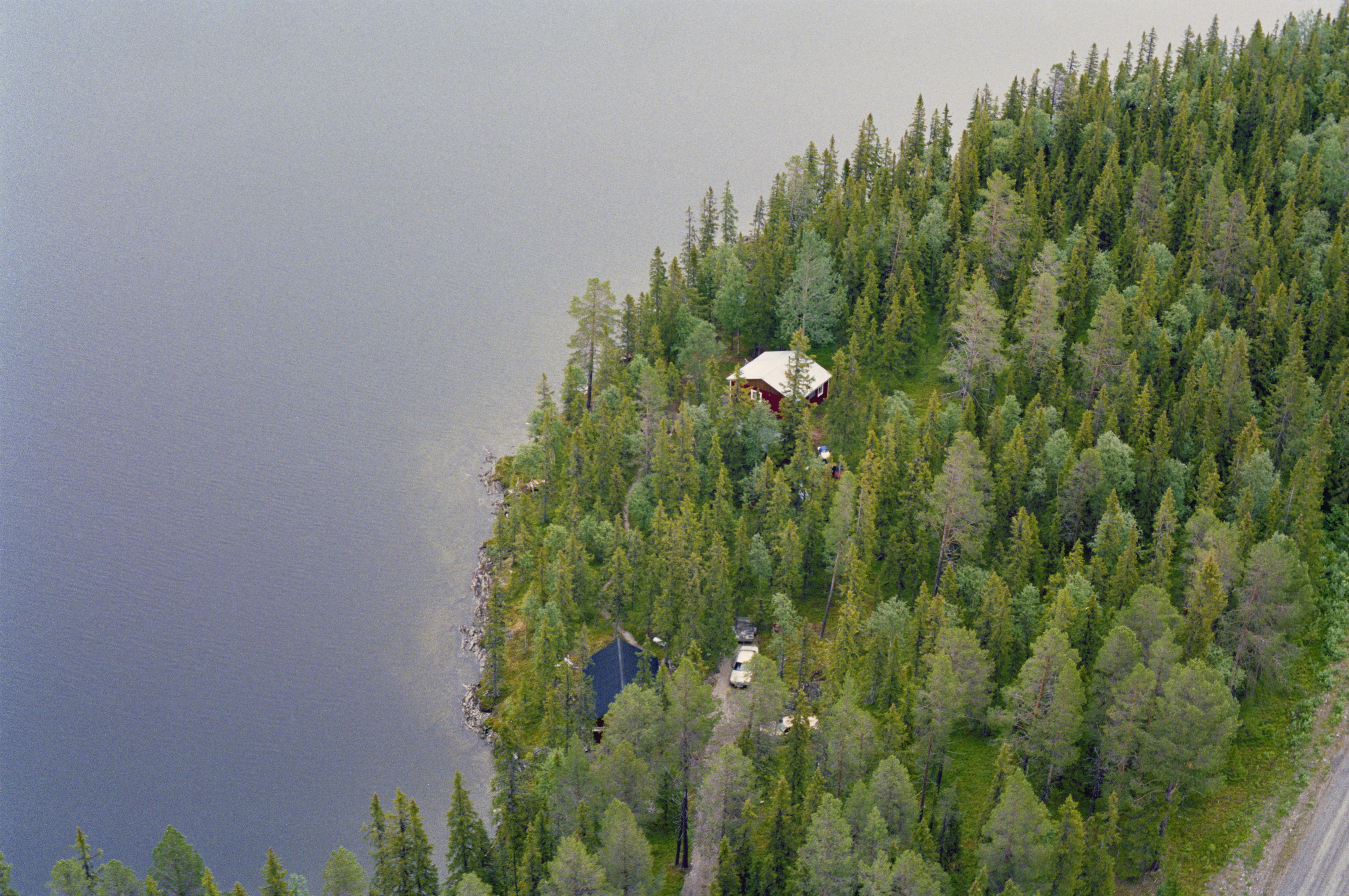 Beskrivning: Fritidshus norr om bergsområdena Geavmoeasie och Vinberget vid Rönnbäckssjöns södra strand, väster i sjön Lill-Björkvattnet (Bearkede). Bilden är tagen mot (väderstreck): ONO