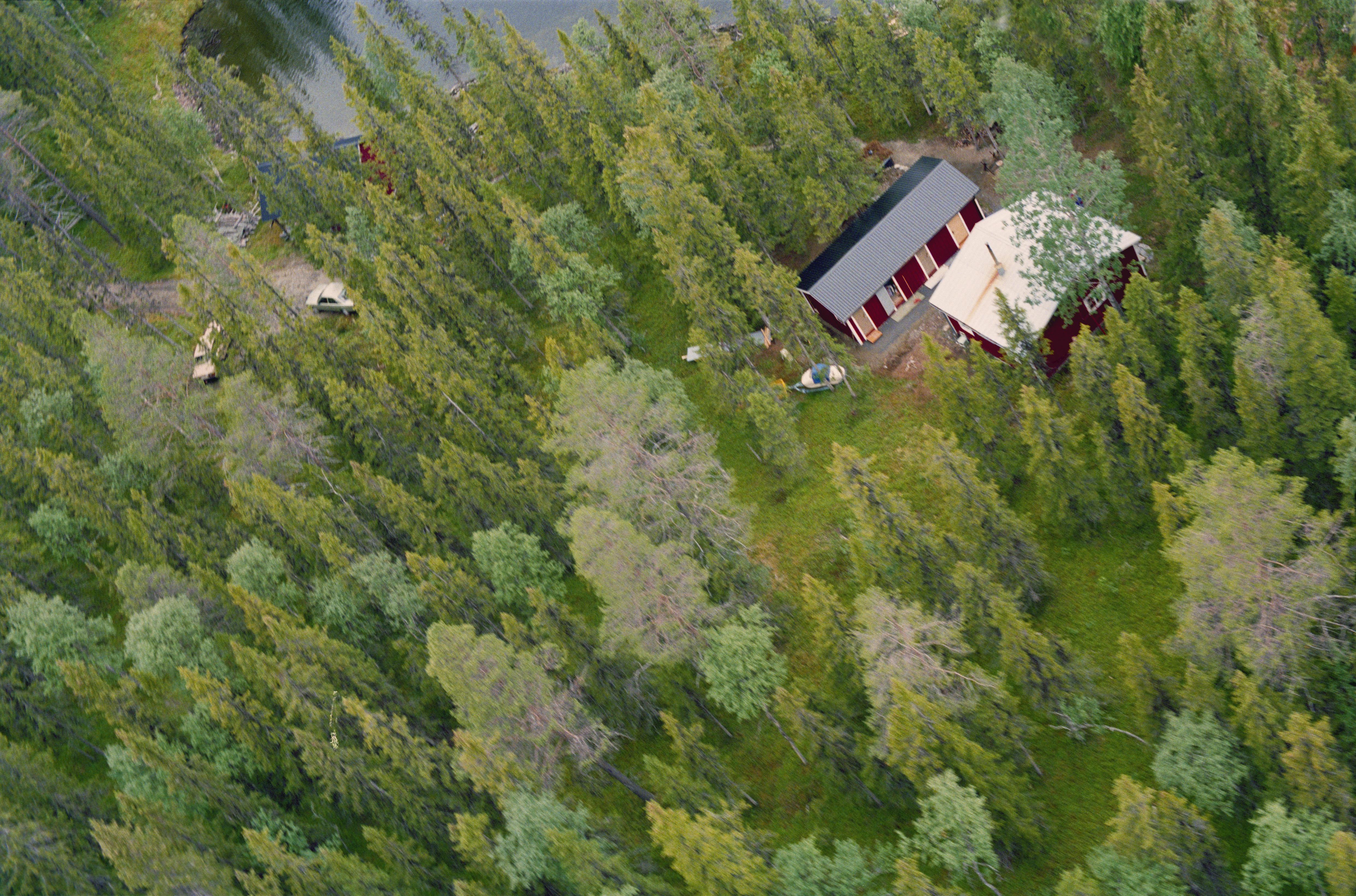 Beskrivning: Fritidshus norr om bergsområdena Geavmoeasie och Vinberget vid Rönnbäckssjöns södra strand, väster i sjön Lill-Björkvattnet (Bearkede). Bilden är tagen mot (väderstreck): VNV