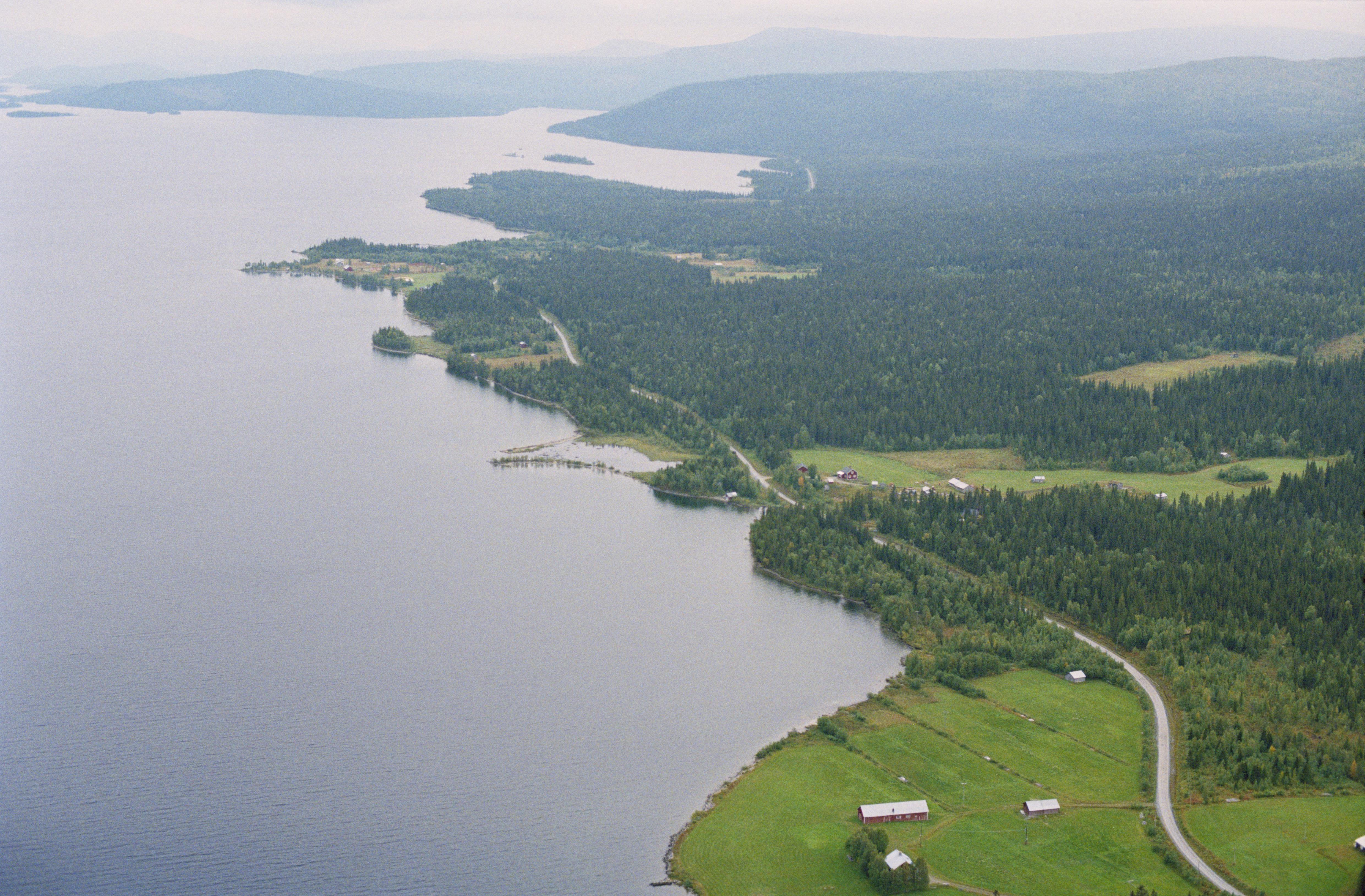 Beskrivning: Stor-Björkvattnet (Bearhkoejaevrie) i Björkvattensdalen. Till höger byn Sörsandnäset (skrivs även Södra Sandnäset). I byn husgrund RAÄnr Tärna 986:1 och kåta Tärna 985:1. Gejmåns utlopp uppe till höger. Bilden är tagen mot (väderstreck): SO