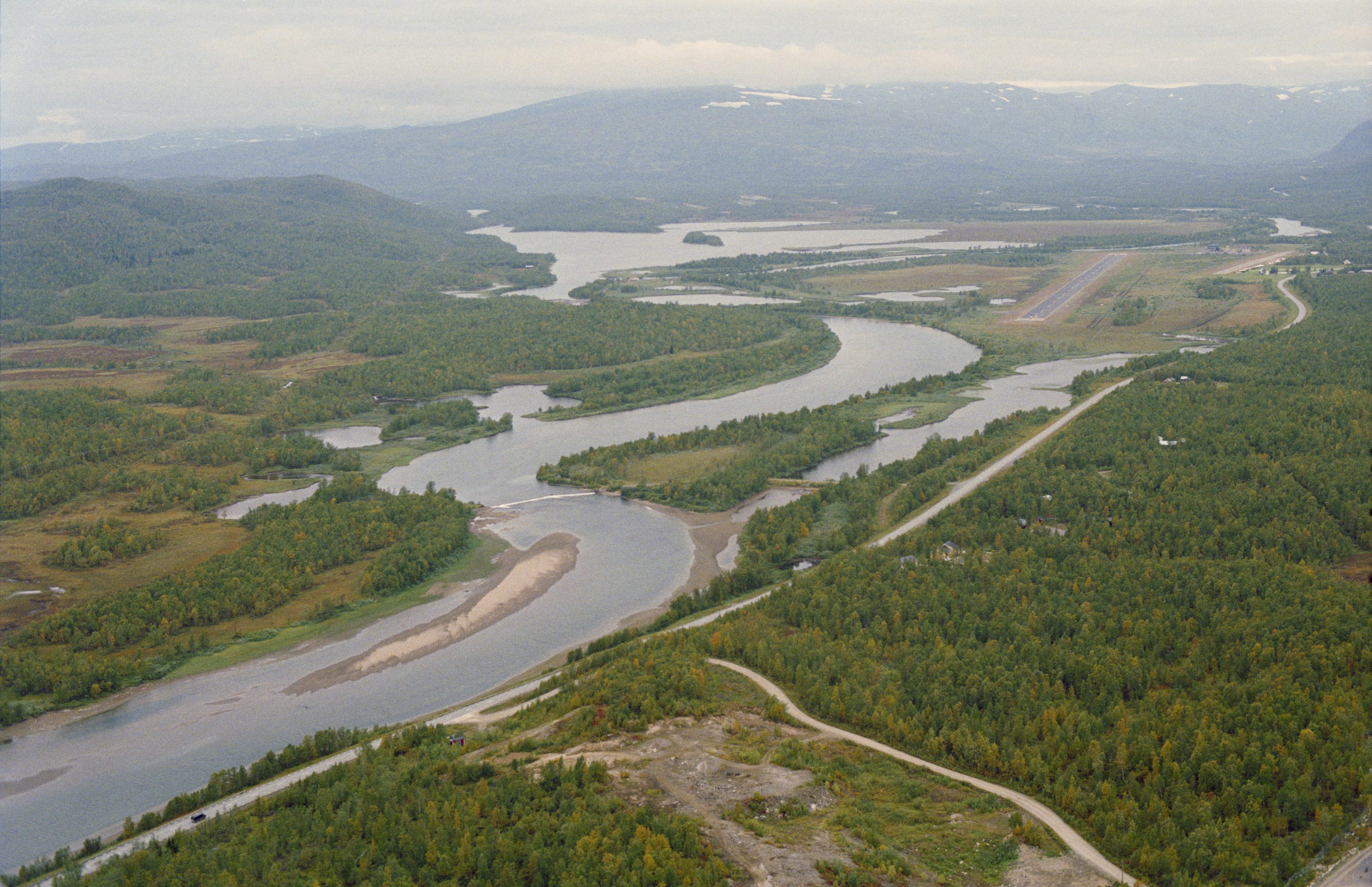 Beskrivning: Umeälvens delta söder om tätorten Hemavan (Bïerke). Till höger över bildens mitt Hemavans flygplats / flygfält och tätorten Hemavan (Bïerke). I tätorten till höger i bildens övre del fornlämningsplats RAÄnr Tärna 1142, 1143 m.fl. Bilden är tagen mot (väderstreck): NV