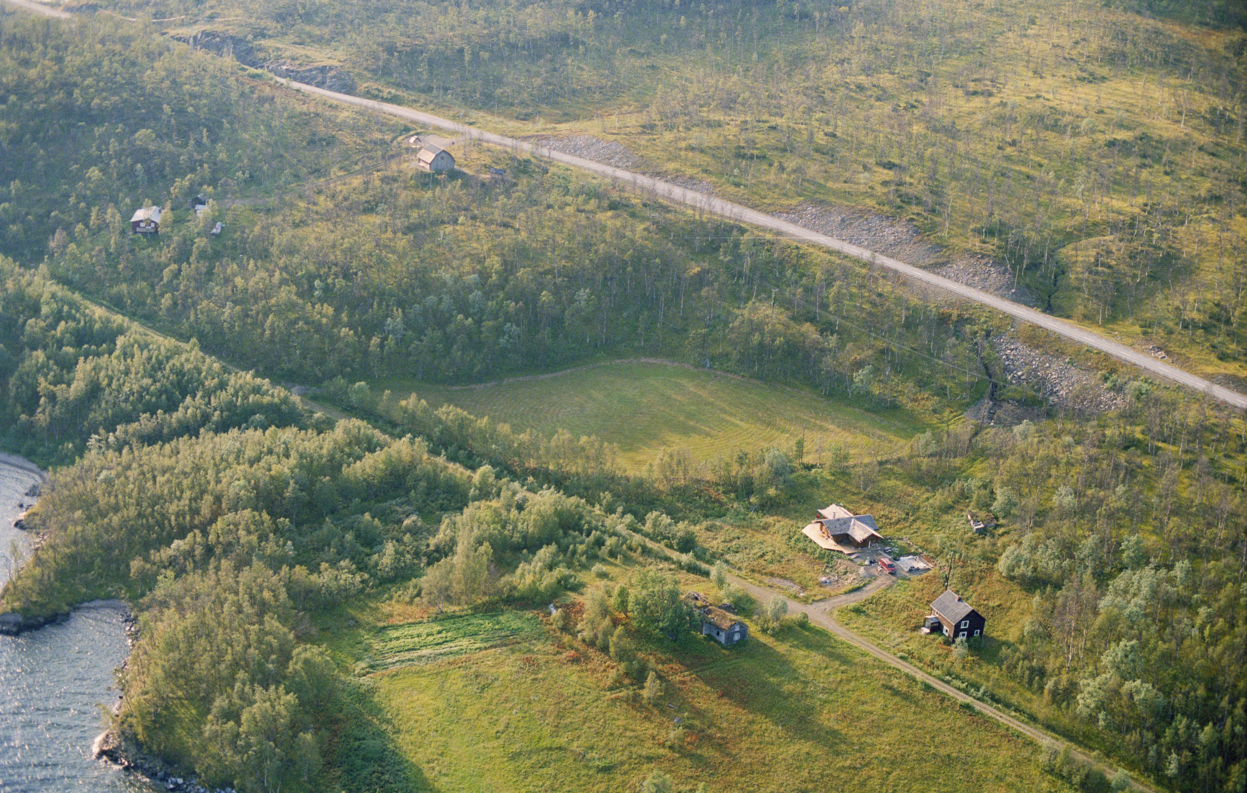 Beskrivning: Östra delen av byn Strimasund (Strijmie) vid sjön Över-Uman (Jillesmes Upmeje). Vila kapell uppe i bildens vänstra hörn. Nya vägen i bildens övre del och gamla vägen i bildens nedre del. Bilden är tagen mot (väderstreck): NV